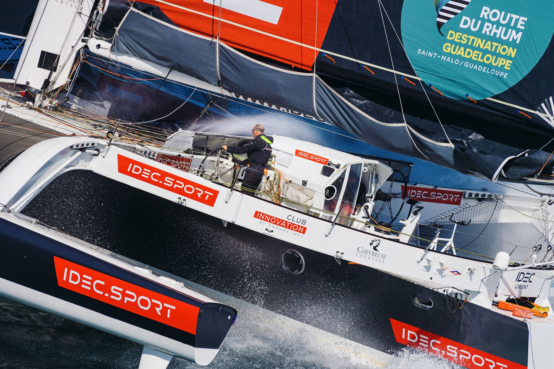 En amarrant hier au soir son Maxi trimaran IDEC SPORT dans le bassin Vauban à Saint Malo, Francis Joyon a lancé le compte à rebours de cette 12ème édition de la Route du Rhum-Destination Guadeloupe. Contrôles de de sécurité, obligations médias, visites de partenaires, Francis et son équipe, Bertrand Delesne, Corentin Joyon, Bernard Stamm, Valentin Kapps et Antoine Blouet se plient à tous ces passages obligés qui vont scander la dizaine de jours à venir. Des jours, des heures que Francis décompte avec l’impatience d’un débutant.