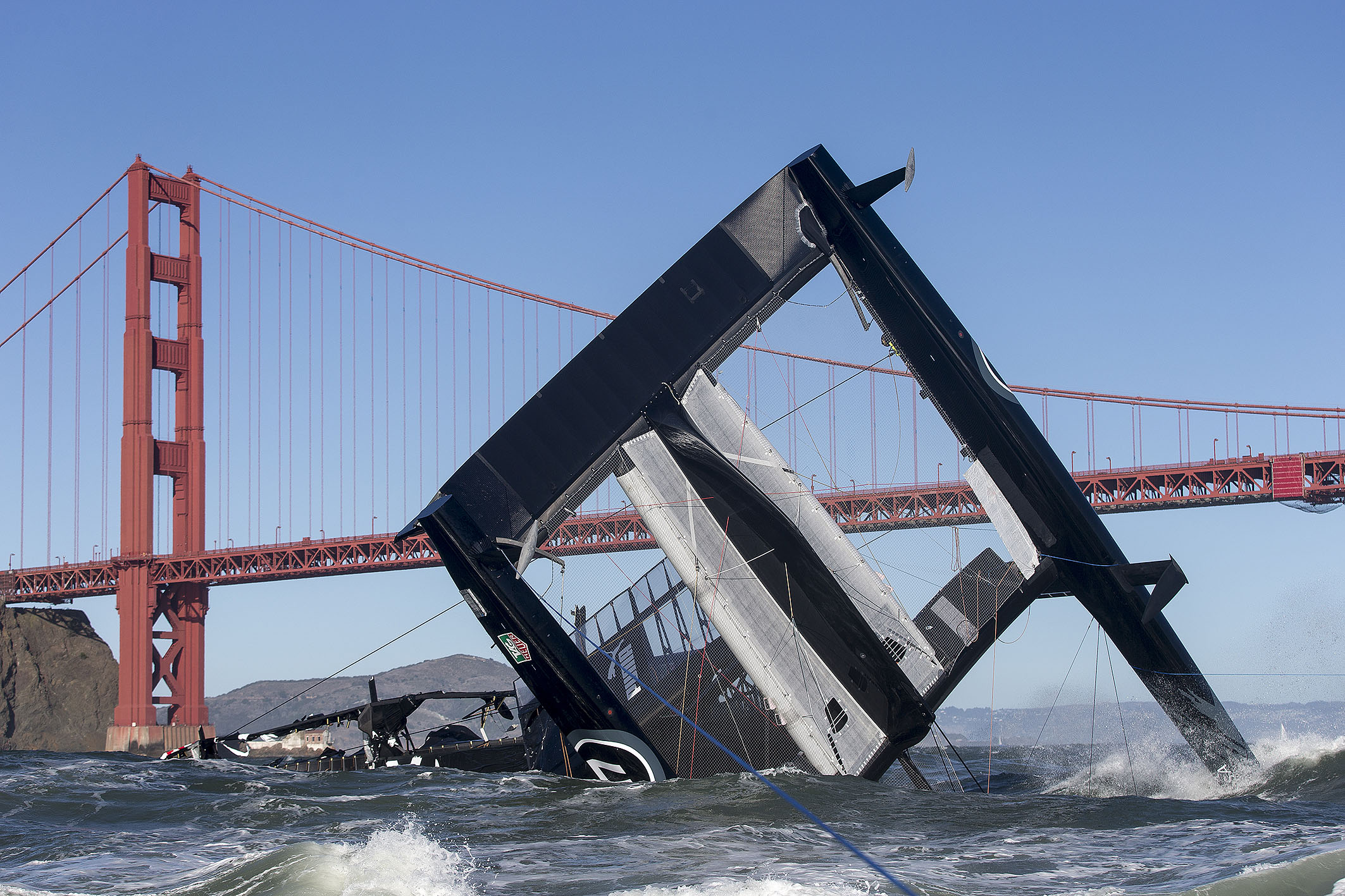 Le chavirage a eu lieu lors de la huitième journée d’entraînement de l‘équipe, au pied du Golden Gate Bridge. Les conditions étaient musclées, avec des rafales formant un fort clapot à la marée descendante de l’un des plus forts coefficients de l’année. Tandis que l‘équipage manœuvrait le catamaran géant par vent arrière, l’avant du bateau a plongé pour ensuite se retourner.