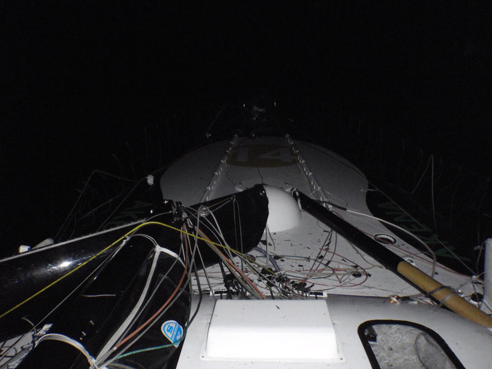 « Nous avons perdu le mât et les voiles, il ne reste plus que la bôme, un deckspreader, et un bout de 1 mètre de tube. C ‘est dommage le début de course était sympa. Aucun de nous n’est blessé à part dans notre amour propre. Nous pensons que le bout de bastaque a cassé en sortie de winch, ou le tirant inferieur du deckspreader. Puis il y a eu des très gros crack, comme si nous étions rentrés à dix nœuds dans une falaise. Mais c’est bien le mât qui s’est cassé en plusieurs morceaux. Ensuite nous avons bataillé une heure pour tout dégager…mais vous connaisser la suite.»