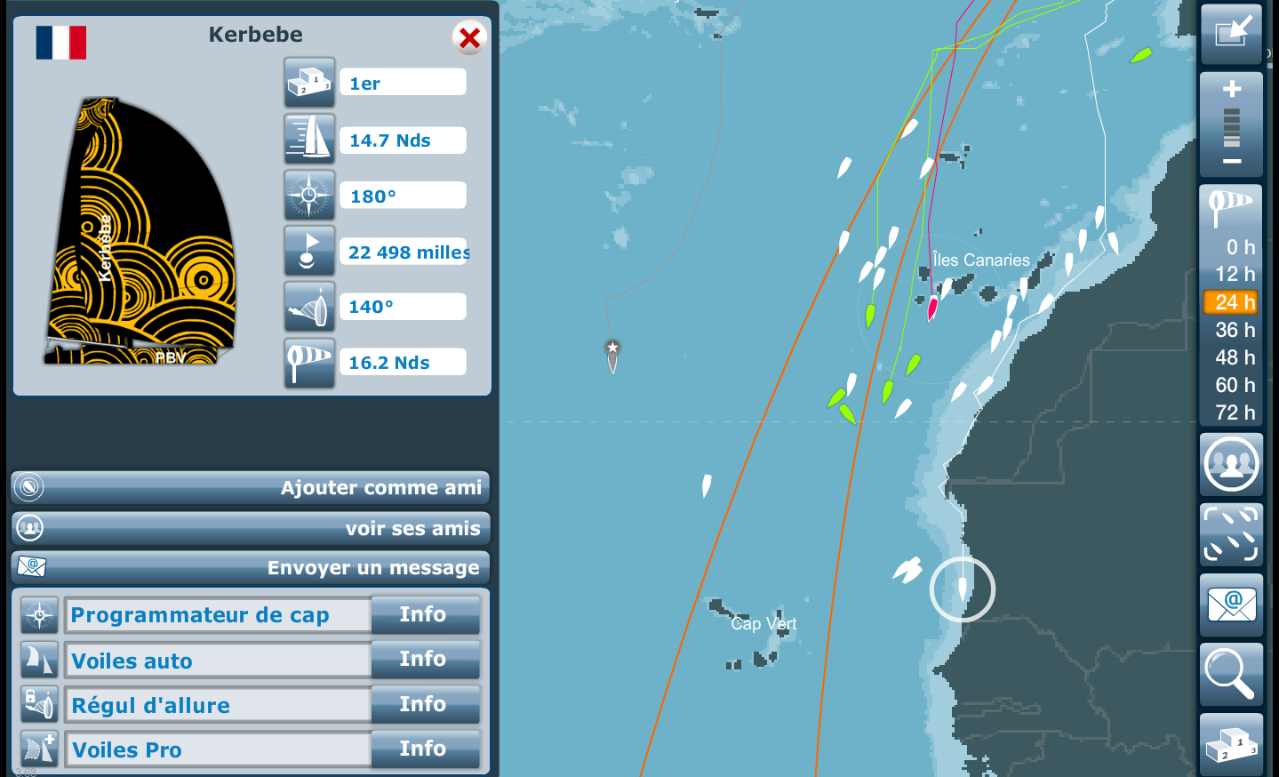 Une tête de course où se situent encore Kerbebe, Axelou furtif et Traban155 TPN toujours collés à la côte africaine à hauteur de la Mauritanie, et désormais accompagnés par chapi-chapo et le polonais Dar_bob_63_zegluj, et talonnés par Windsurfer34.