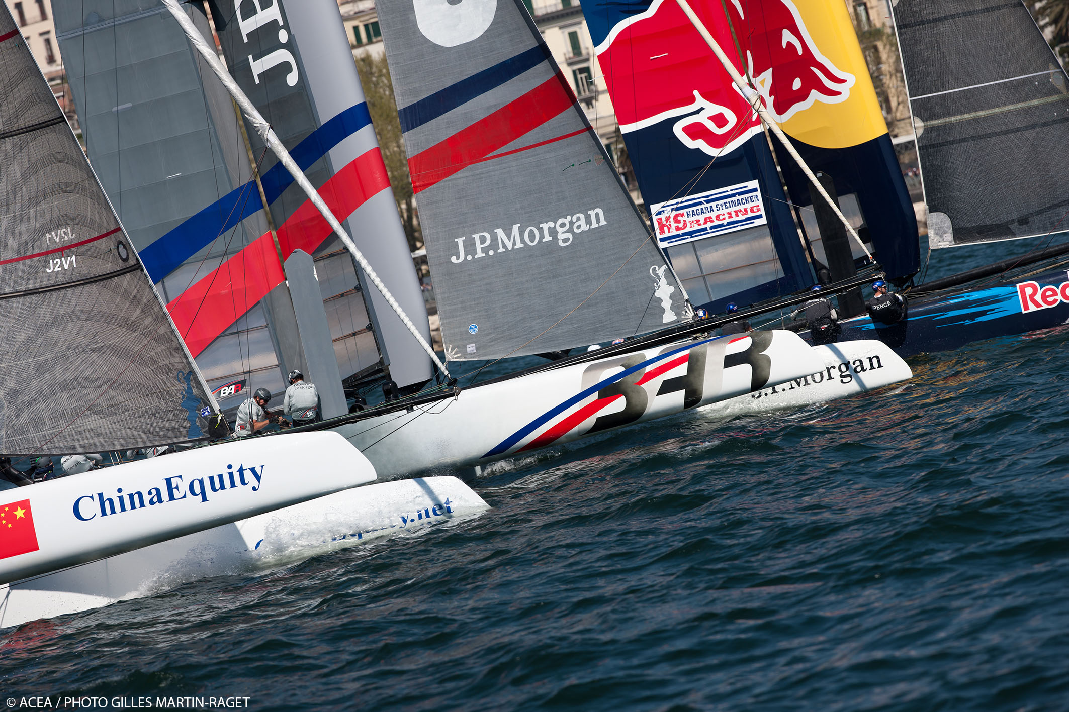 Milieu de ligne, bon départ lancé d’Energy Team qui s’élance dans le premier rideau, en compagnie des archis favoris d’Oracle, Emirates Team New Zealand et Artemis. Le deuxième bord est hélas très défavorable pour les Français. Ils manquent cruellement de réussite sur leur choix de bouée alors que le vent faiblit et sont relégués en fond de classement. A la bouée au vent (marque n°3), devant des milliers de spectateurs napolitains, Oracle vire en tête devant Team New Zealand et Luna Rossa Piranha… mais l’AC45 américain est pénalisé pour avoir effleuré une zone interdite ! Dean Barker n’en demandait pas tant pour s’emparer des commandes et les Kiwis enroulent en tête la quatrième marque. Energy Team bataille pour quitter la dernière place… et y parvient, de haute lutte, en doublant China Team et HS Racing. Au terme des 21 minutes qu’aura duré cette première course en flotte napolitaine, Dean Barker et ses kiwis empochent la victoire devant les Américains d’Oracle et les Anglais de JP Morgan Bar qui complètent le podium. Energy Team doit se contenter de la 7e place.