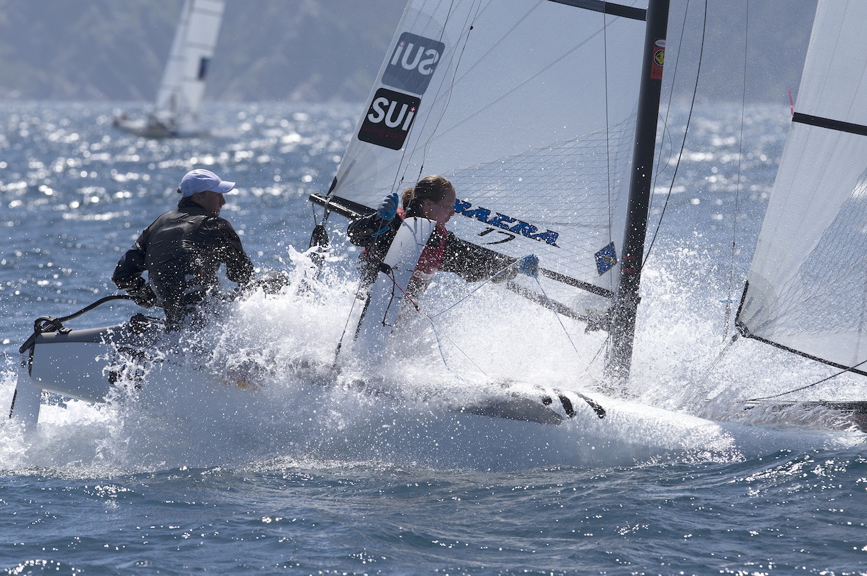Billy Besson et Marie Riou ont grimpé d’un cran aujourd’hui en remportant leur première victoire de manche sur l’épreuve. « C’est top d’être à cette place aujourd’hui ! » se réjouit Marie qui se dit « rincée » par cette journée intense. Le duo français se retrouve à la chasse des suisses Buhler et Brugger. A l’aise dans toutes les conditions, les helvètes sont la révélation de cette semaine de Hyères et leurs réglages sont scrutés à la loupe par les bateaux tricolores.