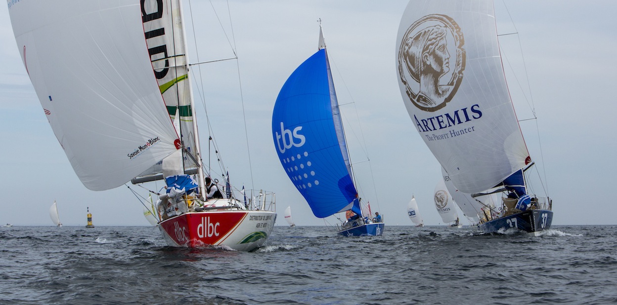 Après un louvoyage en baie d’Audierne, dans un vent léger de sud-est, deux groupes se dessinent à la pointe de Penmarch. Le groupe plus au sud bénéficie d’une meilleure pression du vent : Yann Eliès (Groupe Queguiner – Leucémie Espoir), Paul Meilhat, Armel le Cléac’h, Michel Desjoyeaux (TBS), Claire Pruvot (Port de Caen Ouistreham, Vincent Biarnes, Joan Arhweiler (Région Basse Normandie), Benoît Hochart (IB-Remarketing), Yannig Livory (Thermacote France) ; alors qu’à l’Est, on retrouve Jérémie Beyou, Morgan Lagravière, Jean-Pierre Nicol, Julien Villion, Sam Goodchild (Shelter Box – Disaster Relief), Yoann Richomme (DLBC – Module création), Gilles le Baut (Thalasso Carnac & Spa).