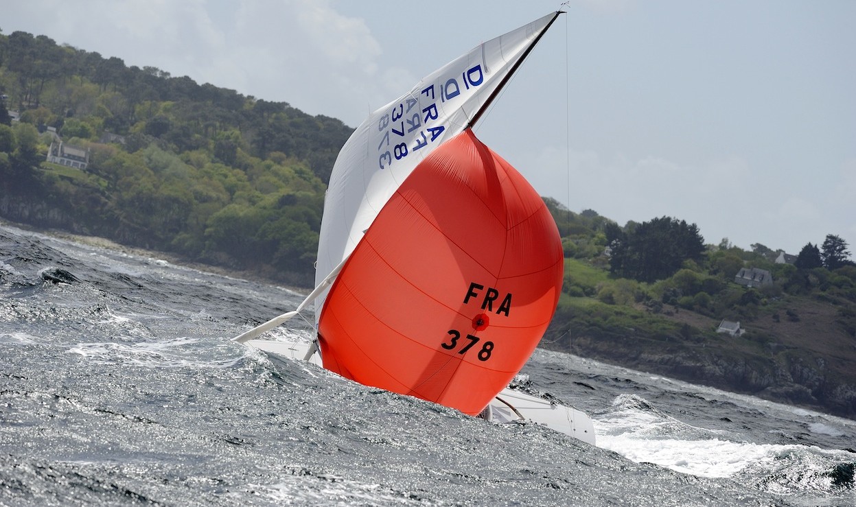 Pour saluer la fin du Grand Prix Guyader, Philippe Faure, le Comité, avait choisi un parcours technique (banane) un peu plus long que les jours précédents (8 milles). Il faisait toujours frais en baie (la faute aux fameux saints de glace), le vent soufflait de l’ouest à 20 nœuds gonflant une houle métallisée qui se confondait avec le ciel chargé de nuages.