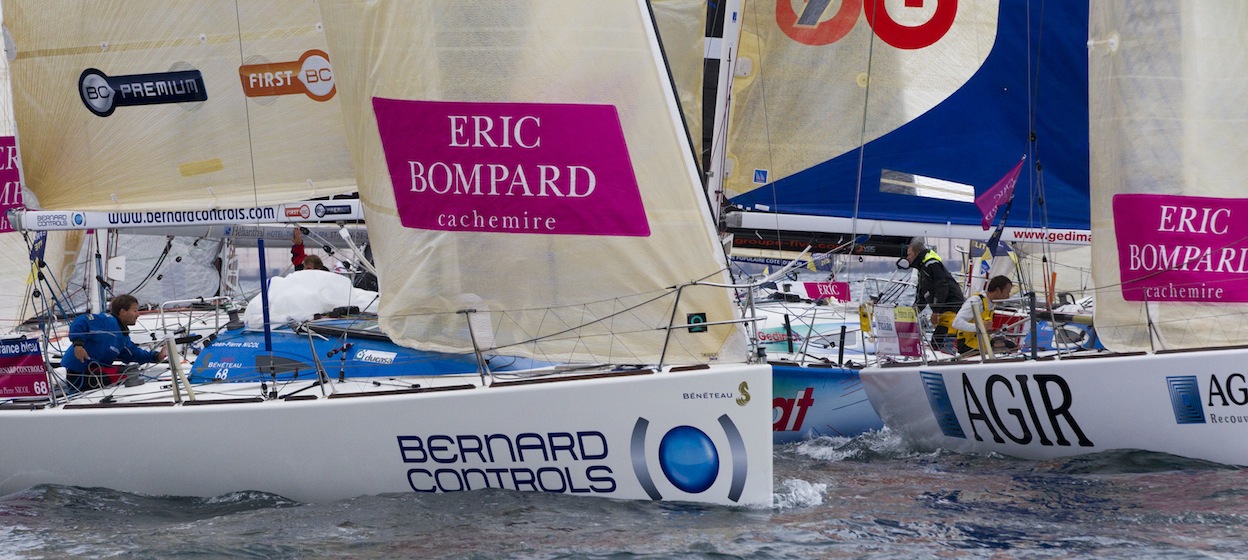 Derrière, c’était l’embouteillage ! La multiplication des spinnakers formait un mur sans vent qui stoppait net plusieurs solitaires à l’image de Michel Desjoyeaux (TBS) alors pointé troisième qui se faisait littéralement avaler par la meute… Le peloton était tellement compressé qu’il fallait faire son trou afin d’affaler la voile ballon et repartir au près dans cette brise d’une quinzaine de nœuds : Yann Eliès (Groupe Quéguiner-Leucémie espoir) dut même effectuer une pénalité de 360° (un tour de bateau sur lui-même) suite à un engagement tardif à la bouée. Quant à Claire Pruvot (Port de Caen Ouistreham), elle se faisait aborder sur son tableau arrière par Gilles le Baud (Carnac Thalasso & Spa) qui abîmait son étrave. Sans trop de gravité puisque les deux concurrents continuaient leur route vers Roscoff.