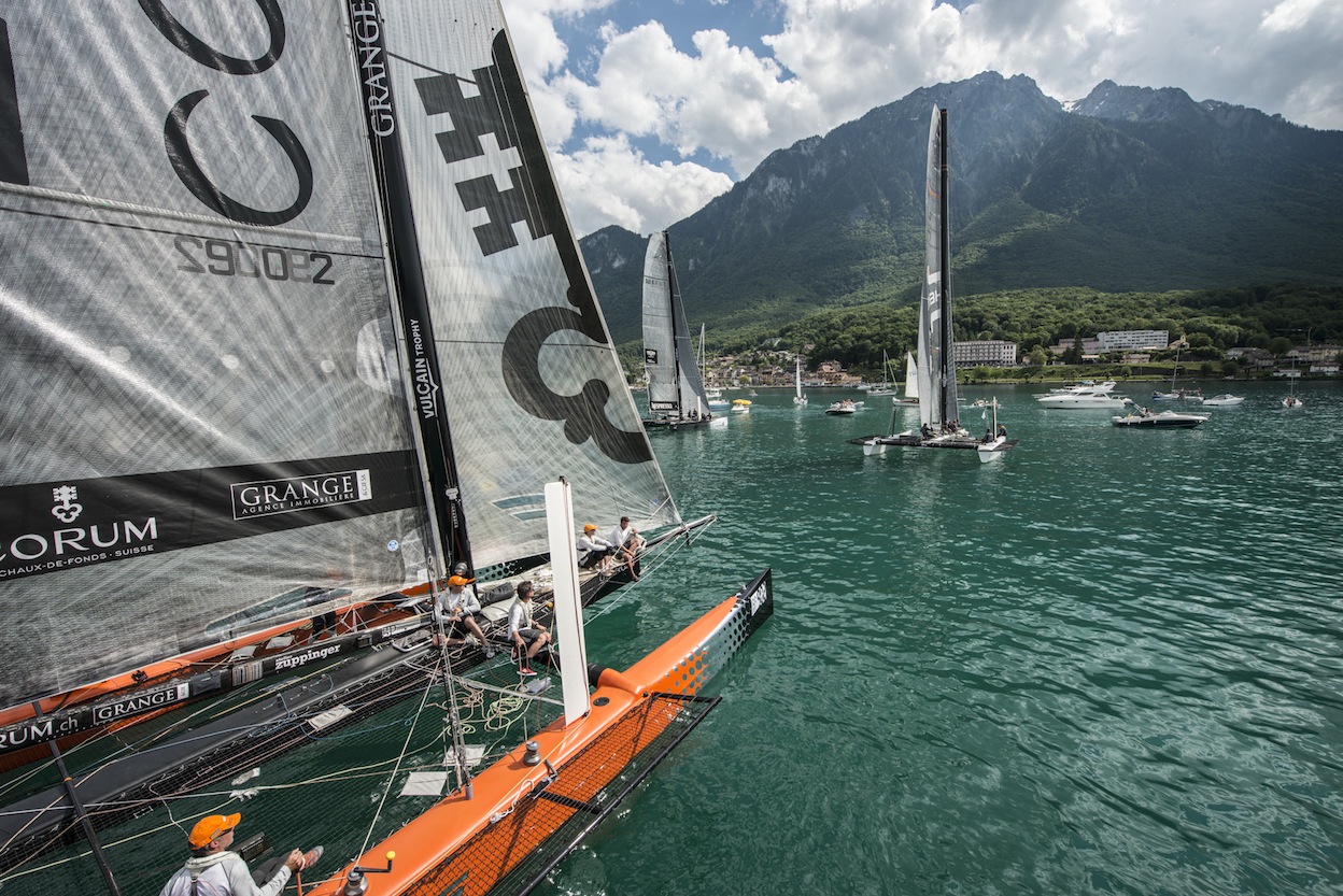 Les multicoques s’accrochent enfin à un petit vent descendant des sommets le long de la côte française. Alinghi, Team Sui9 et Tilt entament une belle bataille durant quelques miles et rejoignent le centre du lac en quête d’airs favorables. Okalys-Corum préfère rester côté français. Excellente stratégie puisqu’il va toucher le vent le premier et dépasser ses concurrents. La course avance, les D35 se regroupent à nouveau, seuls Ylliam-Comptoir Immobilier, Veltigroup et Oryx restent en arrière, les autres prennent la tête du peloton tour à tour.