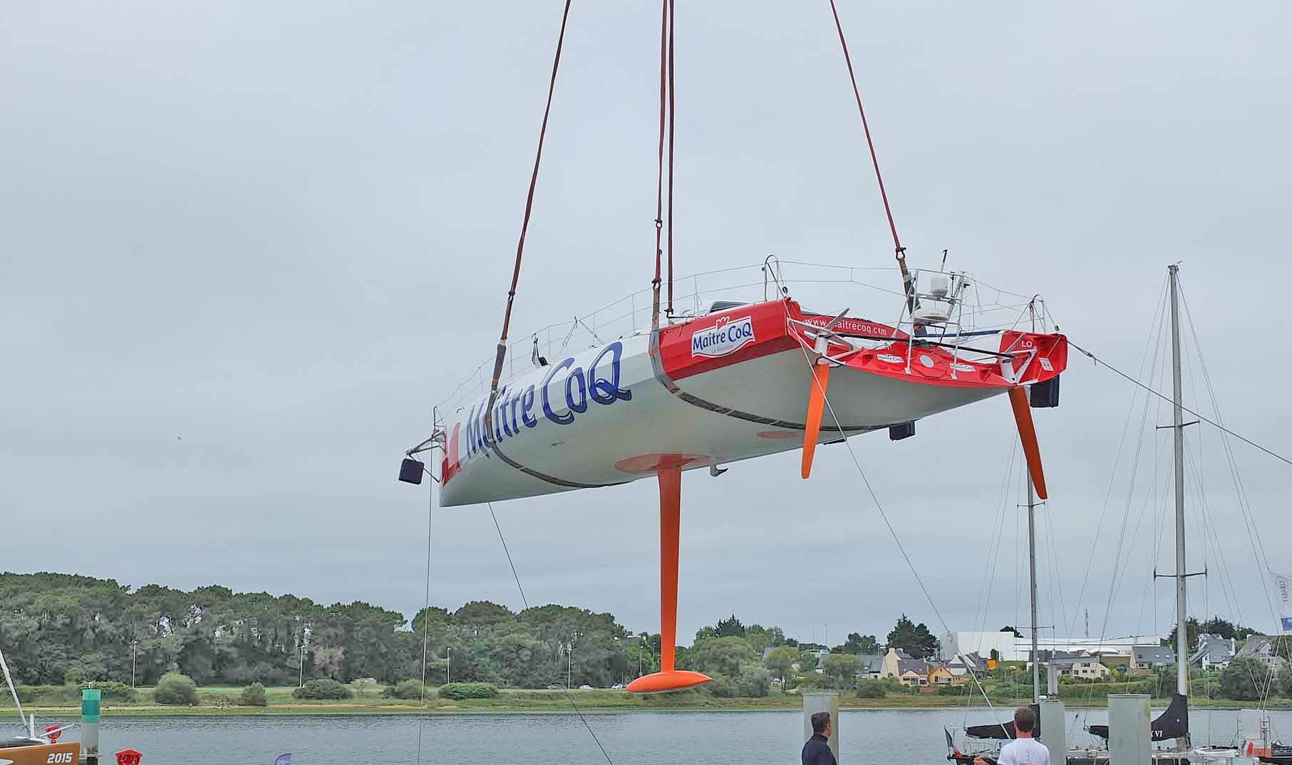 Imoca Maitre CoQ 2 – mise a l eau 31 juillet © Agence Kaori Tout a été démonté, vérifié, expertisé, voire changé lorsque cela était nécessaire au cours de ce chantier technique estival. L’accastillage, les axes, les étais, les appendices… L’Imoca Maître CoQ 2, doté de voiles neuves et d’une nouvelle quête de mât (l’inclinaison de l’espar) est désormais en configuration « Transat Jacques Vabre ».