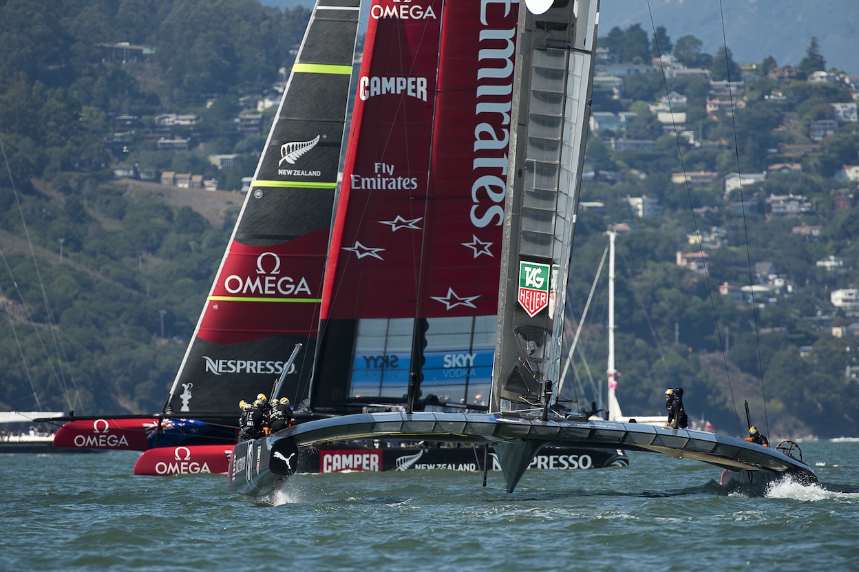 Le premier duel du jour s’est de nouveau joué sur le 3ème bord décisif, au près et long de 3 milles nautiques, sur lequel le challenger Emirates Team New Zealand a enchaîné une série de virements efficaces (pas moins de 14 !) et a pris la tête de la course face au defender ORACLE TEAM USA qui les a temporairement mené jusqu’à la 2ème marque sous le vent.