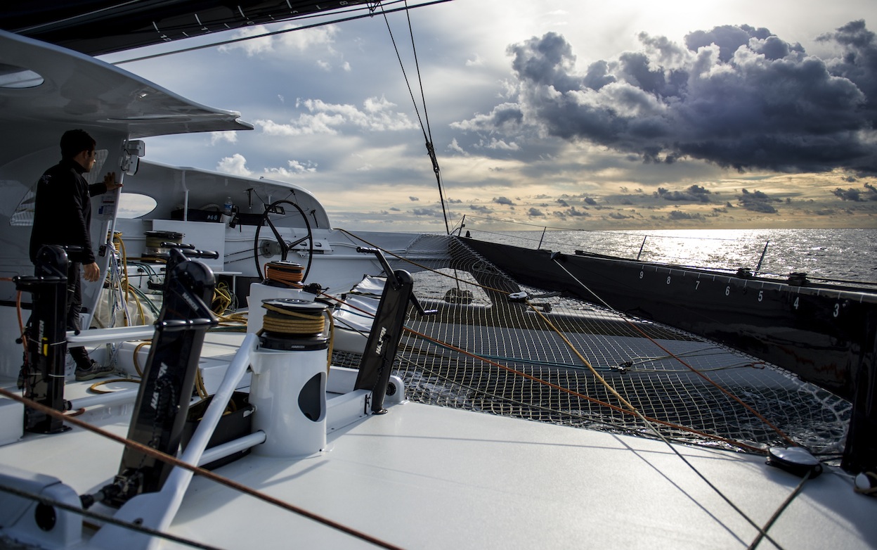 La vitesse instantanée du maxi trimaran demeure élevée, mais le gain sur la route tombe à quelques 5 à 6 noeuds. Un investissement nécessaire, et dont les dividendes ne tarderont pas à se manifester dès que Spindrift 2 orientera de nouveau ses trois étraves vers San Salvador. D’autant que son adversaire virtuel, Groupama 3 avait lui aussi, en un moment similaire de son record de 2007, dû mettre en oeuvre la même stratégie. Si la manoeuvre de changement d’amure aux allures portatives demeure à bord du plus grand trimaran du monde une opération longue et délicate, tant il importe d’anticiper chaque opération. « Nous ajustons en permanence notre toile en fonction de l’orientation du vent et de l’état de la mer. » explique Yann. Maintenir en permanence des vitesses supérieures à 30 noeuds suppose en effet une adaptation constante du jeu de voile aux conditions changeantes de l’alizé. « Nous sommes ainsi passés sous les Canaries avec 3 ris dans la grand voile et trinquette quand le vent flirtait avec les 30 nœuds » poursuit Yann. « Nous alternons en permanence les combinaisons 2 ris, puis un ris, avec à l’avant le solent ou le gennaker. Les ballasts hier nous ont aussi bien aidé à faciliter le passage des étraves dans une mer décidément bien désordonnée. Nous avons connu quelques grains cette nuit, et il y’a eu pas mal d’ajustements à effectuer pour éviter de se faire surprendre avec la grand voile haute et gennaker. »