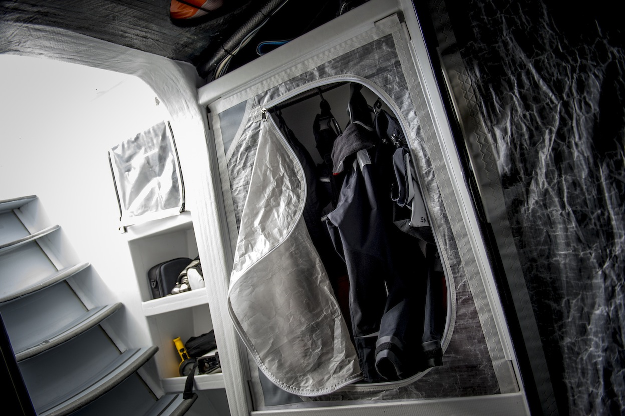 La vie à bord de Spindrift 2 a ainsi singulièrement changé en quelques heures. Aux milles facilement gagnés quand le grand oiseau noir, blanc et or volait à plus de 30 noeuds en équilibre sur la crête des vagues, succède une progression plus laborieuse, où l’inertie des 25 tonnes du géant lutte dans moins d’une dizaine de noeuds de vent, quand les orages ne viennent pas, comme ce fut le cas cette nuit, compliquer davantage encore la vie de l’équipage avec ces brusques changements de force et de direction du vent sous les grains. « Il faut cravacher, profiter de la moindre risée pour gagner dans l’ouest » martèle Guichard. « La mer s’est bien aplanie, et nous sommes exactement sur la route. L’attention aux réglages est maximum, et si nous n’avons rien changé à notre rythme de vie et de quart, on sent bien que chacun veille au grain, au détail qui facilite le jeu de plus en plus fin des barreurs. »