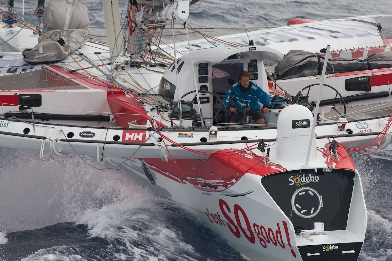 Seul à bord de Sodebo, Thomas Coville remonte le Golfe de Gascogne face au vent en direction de Brest où il devrait arriver samedi matin. Hier à 15h30, la casse du cordage qui retient l’une des voiles d’avant (le petit gennaker) a arraché le balcon du maxi-trimaran. Sans cette rambarde métallique, la sécurité du marin à l’étrave de son bateau est impossible. Une prise de risque inimaginable sur un tel tour du monde. En décidant de retourner à son point de départ pour remettre le bateau à 100% de son potentiel et repartir au plus vite, le skipper a fait le meilleur choix, pas le plus facile certes, mais certainement le plus sage.