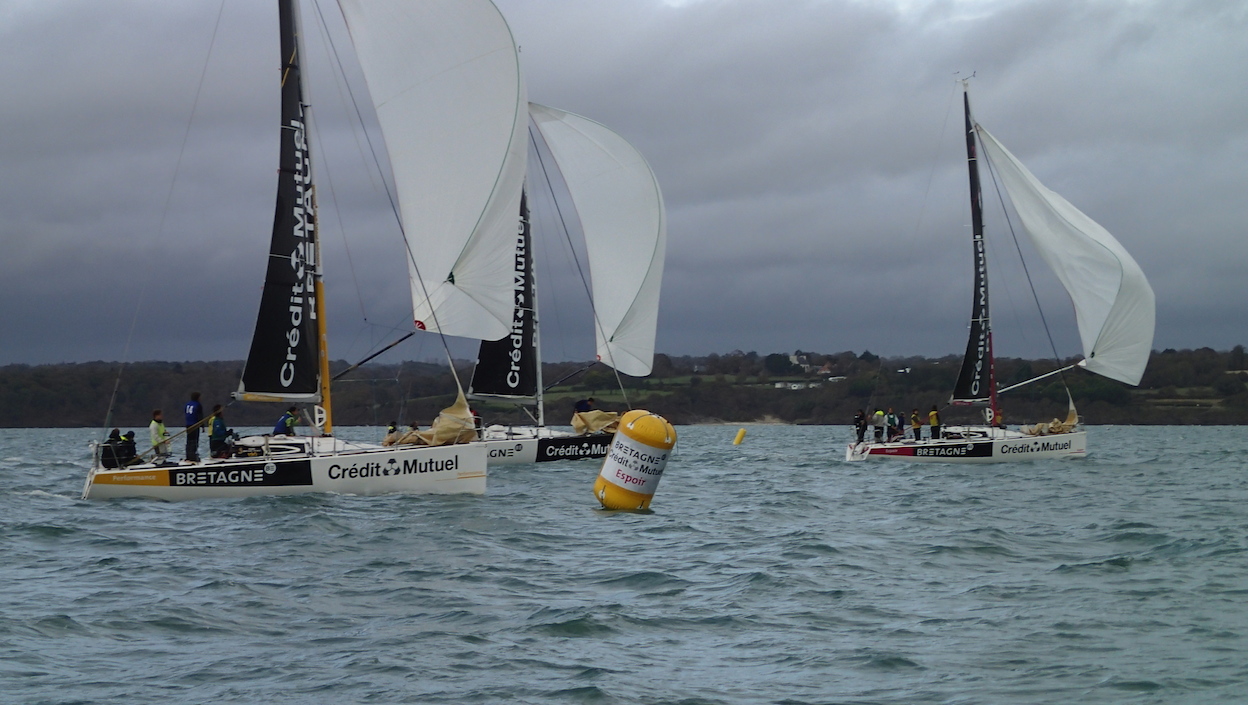 Nedeleg Bigi, Hugo Kerhascoet et Sébastien Simon se sont entraînés toute la semaine passée, en double, sur les trois bateaux aux couleurs Bretagne-Crédit Mutuel mis à leur disposition à Port-la-Forêt. Une nouvelle fois des coureurs du Pôle Finistère les ont aidés dans cette préparation : Romain Attanasio, Thierry Chabagny, Sébastien Col, Jeanne Grégoire, Damien Guillou, Corentin Horeau, Nicolas Lunven, Paul Meilhat. Nedeleg, Hugo et Simon ont maintenant toutes les cartes en main pour être lâchés en solitaire… à eux de jouer ! Régates prévues dès cet après-midi jusqu’à vendredi. Le nouveau skipper Bretagne-Crédit Mutuel Espoir sera donc connu vendredi prochain en présence des représentants des partenaires, Jean-Pierre Denis, président du Crédit Mutuel de Bretagne et Jean-Michel Le Boulanger, vice-président du Conseil régional de Bretagne.