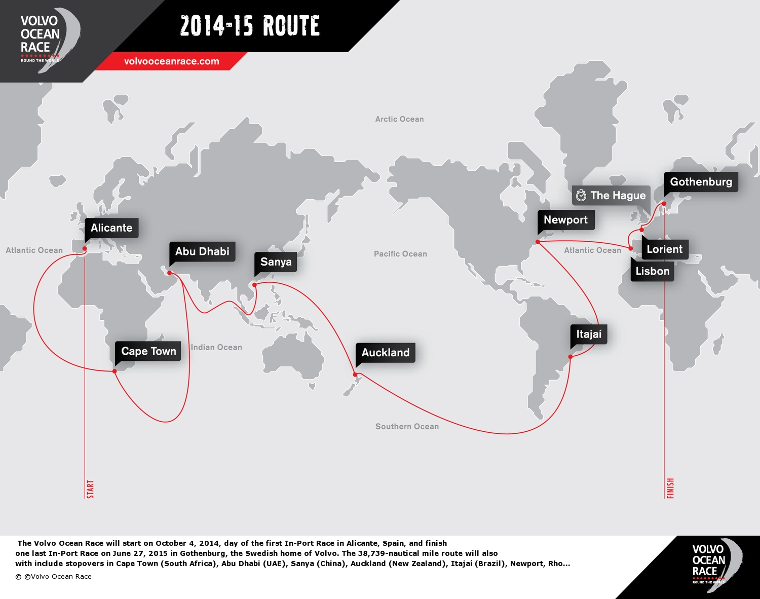 Retrouvez ici le parcours de cette 12e édition del Volvo Ocean Race ! Neuf mois et 38 739 milles qui débutent le 4 octobre 2014 avec la première course In-Port à Alicante, et terminent avec une dernière In-Port le 27 juin 2015 à Göteborg, siège suédois de Volvo. L’avant-dernière escale : le port français de Lorient dans le Morbihan.