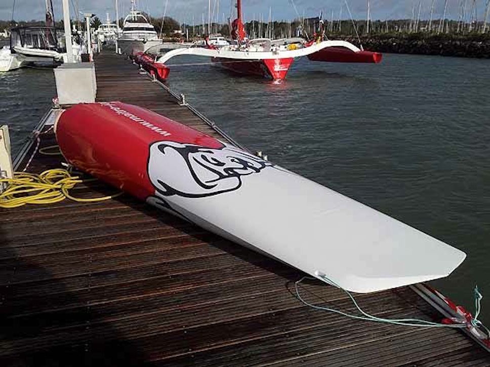 Incroyable ! L’étrave du flotteur tribord du Multi 50 Maître Jacques, qui s’est cassée lors de la Transat Jacques Vabre en novembre dernier au large du Golfe de Gascogne, a dérivé jusqu’en Bretagne Sud, à proximité de Port la Forêt, où est justement amarré Maître Jacques !!! Elle a été gentiment récupérée par des pêcheurs, qui ont alerté Loïc…