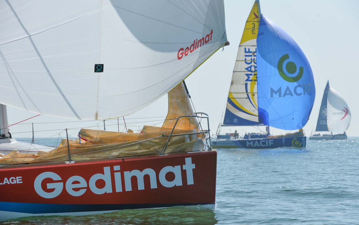 Magnifique départ ! Les 35 solitaires et les 3 duos de la Solo Maitre CoQ viennent donc de s’élancer en direction de l’Ile d’Yeu, sous un magnifique ciel bleu… mais dans des vents plutôt erratiques. La petite brise de sud/est a rendu le départ compliqué pour des coureurs pressés d’en découdre mais trop nombreux au dessus de la ligne. Il faudra s’y reprendre à trois fois pour prendre un bon départ, à 12 h 35, sauf pour Eric Péron (Generali) et Vincent Biarnes (Prati Buches) qui ont franchi la ligne dans la minute avant le départ et ont été obligé de venir la couper à nouveau tout en prenant 2 heures de pénalité…