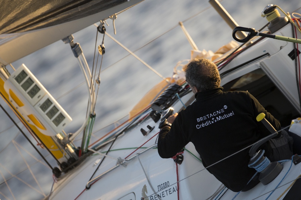 « C’était une nuit difficile. Nous n’avons pas vu la lune, il y avait pas mal de nuages. Je n’ai pas dormi, donc il va falloir que je me repose dans la journée. Nous ne sommes pas tous les deux sur le pont, nous nous relayons toutes les heures car sinon nous ne pouvons plus regarder les compteurs. Tes yeux sont tous brouillés. Nous sommes en cirés, en chaussettes étanches et en bonnet étanche. Je ne pensais pas que nous ressortirions le ciré ! Nous avons 25 nœuds de vent. Il y a de gros nuages mais ce ne sont pas des grains. La mer, comme on ne voit rien, c’est un champ de mines. Aux dernières nouvelles, nous avons un empannage à faire pour deux heures seulement. Plus on avance, plus le vent va être à droite, ce qui sera favorable. Enfin, nous avons tenu la cadence ! Je suis content, car les jeunes devant, ils vont vite. Hier Generali nous a mis 8 milles dans la bataille. Ça fait mal. Donc là, je suis content. »