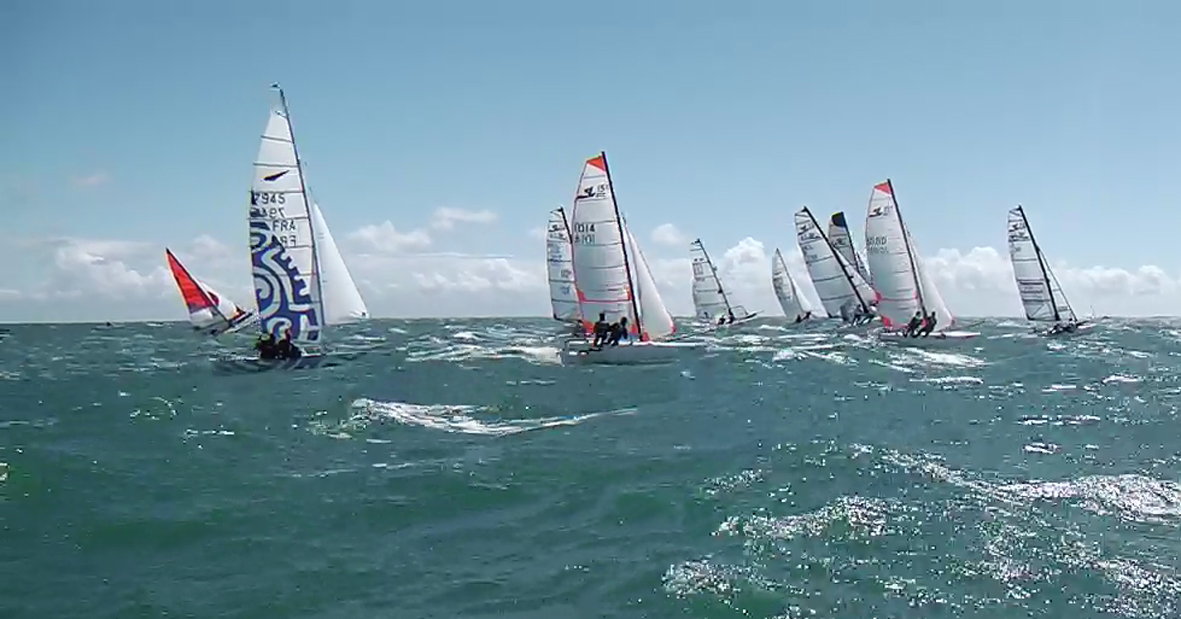 Sur zone les conditions étaient plutôt musclées avec un vent à 25 nœuds et des rafales à 27 nœuds. Chaque concurrent s’est rendu sur sa zone de course pour un 1er départ à 15h. Les F18 et les C1 n’ont pas validée de course aujourd’hui car le vent était trop fort et la mer trop formée. Le comité de course les a renvoyé à terre. Chez les plus petits, C3 et C4, les conditions étaient moins difficiles, une course a été validée.