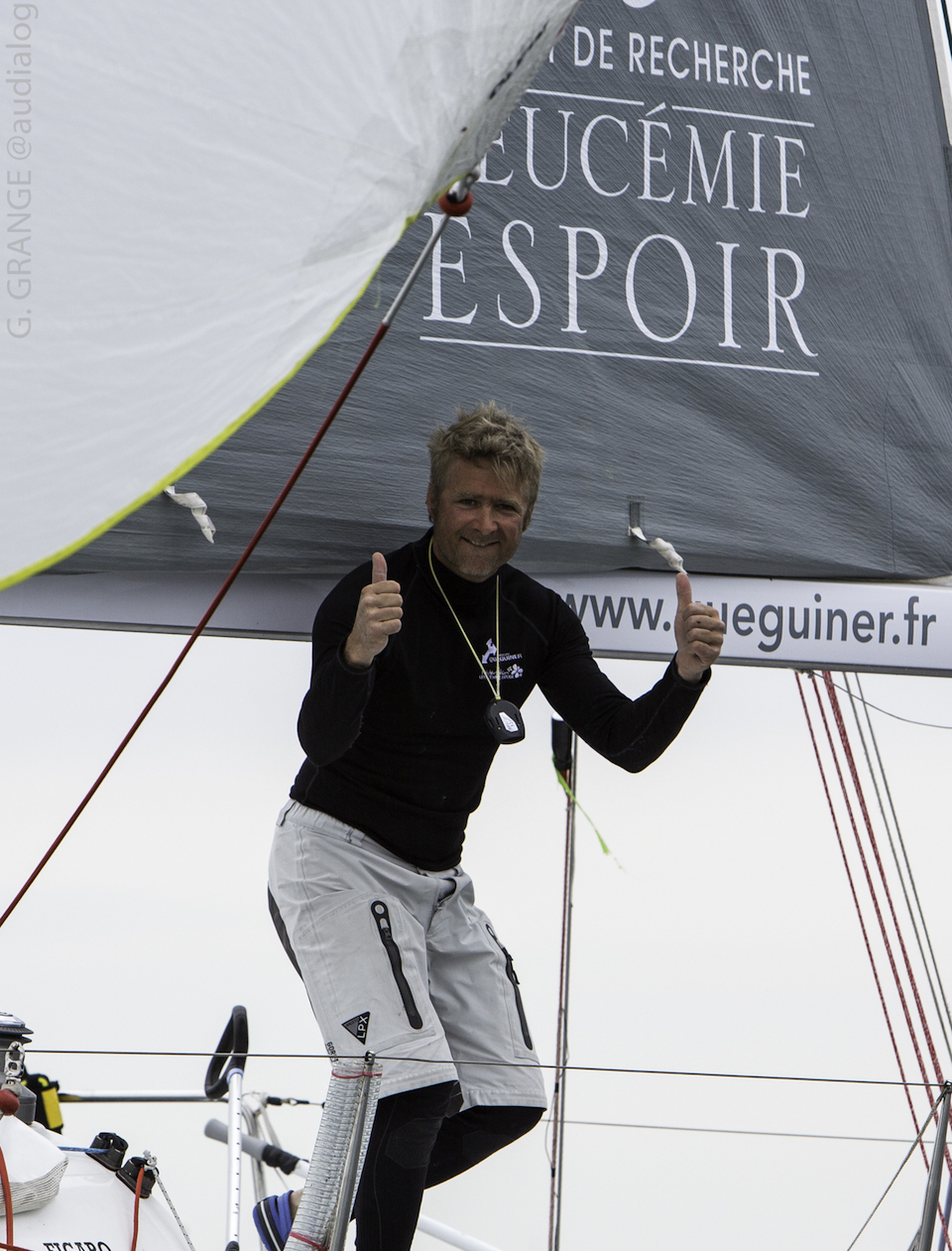 A bord de Groupe Queguiner – Leucémie Espoir, Yann Eliès aura été le plus rapide des 32 figaristes engagés à avaler les 340 MN du parcours de la Solo Concarneau – Trophée Guy Cotten. Bord à bord sur une grande partie de la course avec Adrien Hardy (Agir Recouvrement), et suivis de près par Jérémie Beyou (Maitre CoQ), les trois marins ont offert un final de toute beauté pour l’arrivée dans le chenal de Concarneau. Après plusieurs empannages dans un vent mollissant, Yann Eliès franchissait la ligne en vainqueur, suivi 29 secondes plus tard par Adrien Hardy, et 68 secondes pour le skipper de Maitre CoQ.