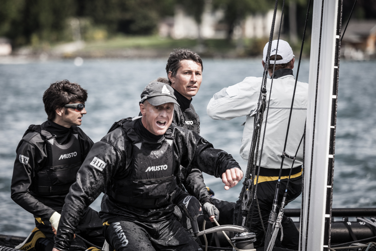 Dès la première course le ton est donné, Alinghi et Realstone s’engagent sur la ligne de départ, c’est à qui passera le premier. Le face à face, Ernesto Bertarelli contre Jérôme Clerc, est fort en émotions mais c’est finalement Alinghi qui passe et remporte la manche.Manche 2 : le vent monte jusqu’à 15 nœuds. Realstone loupe son départ et vient toucher la bouée mais termine deuxième derrière Ladycat powered by Spindrift racing. Cédric Schmidt, le régleur s’explique : « le plan d’eau était très oscillant aujourd’hui, nous avons été victimes d’une bascule de vent à gauche juste sur la ligne ce qui nous a propulsés sur la bouée, mais ces oscillations nous ont aussi été favorables, particulièrement sur le dernier bord au portant où nous avons trouvé une belle ouverture».La troisième manche est marquée par l’abandon de Django racing : DNS, problème hydraulique.En attendant, Nicolas Charbonnier, le tacticien d’Alinghi, place le bateau très justement par rapport à la flotte et ça marche, le multicoque d’Ernesto Bertarelli finit à la première place.