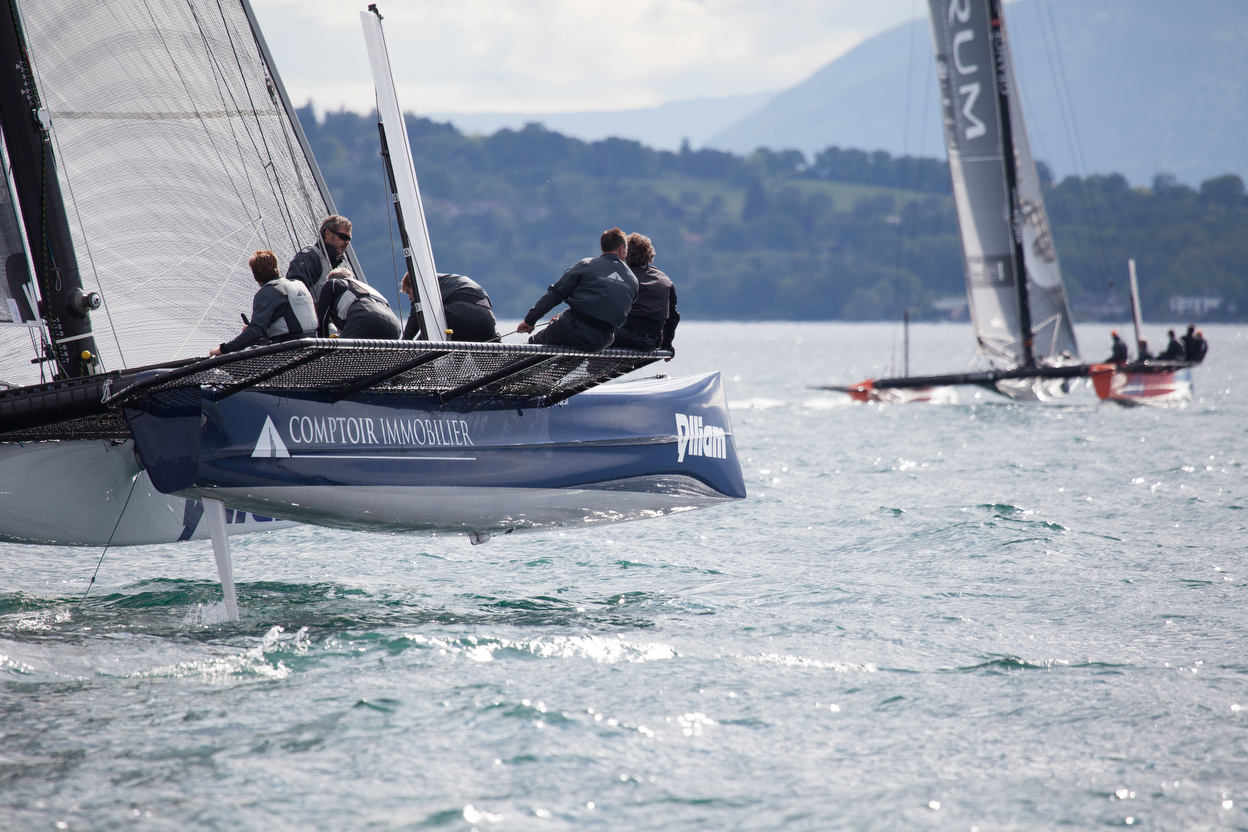 Tilt, Realstone et Ladycat powered by Spindrift racing s’emparent du podium de l’Open de Crans. Le classement général du Vulcain Trophy est maintenant très compact dans le haut du tableau avec une première place de Ladycat powered by Spindrift racing et quatre équipages à égalité de point juste derrière. Généreux avec les Décision 35, les vents ont bien soufflé samedi et offert six belles manches aux multicoques. Tilt domine ce premier jour de l’Open de Crans et se jouent des vents tournants et des effets de terre. L’équipage de Lucien Cujean et de Sébastien Schneiter remporte deux victoires, malgré un léger fléchissement lors de la troisième manche, Tilt ne descendra plus du podium de toute la journée. Lucien Cujean est heureux, l’équipage remporte son premier Grand Prix sur le circuit Vulcain Trophy : «Nous sommes jeunes et physiques, on aime avoir des sensations donc on peut parfois être un peu pirates sur les lignes de départs. On a réalisés des coups tactiques en phase avec le vent et le travail fournit en amont nous apporte la régularité.» La première manche d’abord annulée pour cause de bascule de vent sera ensuite marquée par une jolie deuxième place d’Okalys, Tilt l’emporte tandis que Realstone assure une troisième place. Au départ de la manche 2, Ylliam- Comptoir immobilier profite du mouillage d’un nouveau parcours pour réparer une avarie légère, Okalys démarre fort mais perd son avance au profit de Tilt, Realstone et Oryx qui décroche la troisième place. Encore un départ ! Le troisième de la journée, et Veltigroup, toujours bien placé est à nouveau 4ème, Ladycat powered by Spindrift racing termine en tête et remporte aussi la course suivante. Les deux dernières manches sont marquées par des conditions particulièrement changeantes qui obligent le comité à revoir l’axe de course et à annuler une procédure. ZenToo, très à l’aise en profite et termine premier puis deuxième, tandis que Realstone, vainqueur de la dernière manche, termine à égalité de points avec Tilt. Comblés, les équipages ont prolongé la journée au cours d’un dîner concocté par le Club Nautique de Crans.  Régater c’est aussi savoir être patient, dimanche le vent tarde mais les équipages sont satisfaits avec six belles manches courues la veille alors ils trompent l’attente ; au programme : foot, baignade et histoires de marins. Ladycat powered by Spindrift racing est premier au classement provisoire du championnat des D35, pour Christophe Espagnon le numéro 1 : « l’Open de Crans n’était pas simple mais on savait qu’en prenant la troisième place on passerait premiers au provisoire. On va poursuivre sur cette lancée pour la Genève-Rolle-Genève, nous sommes une équipe tournée vers la course au large et affectionnons particulièrement ce type de course,» Rendez-vous est pris le juin.