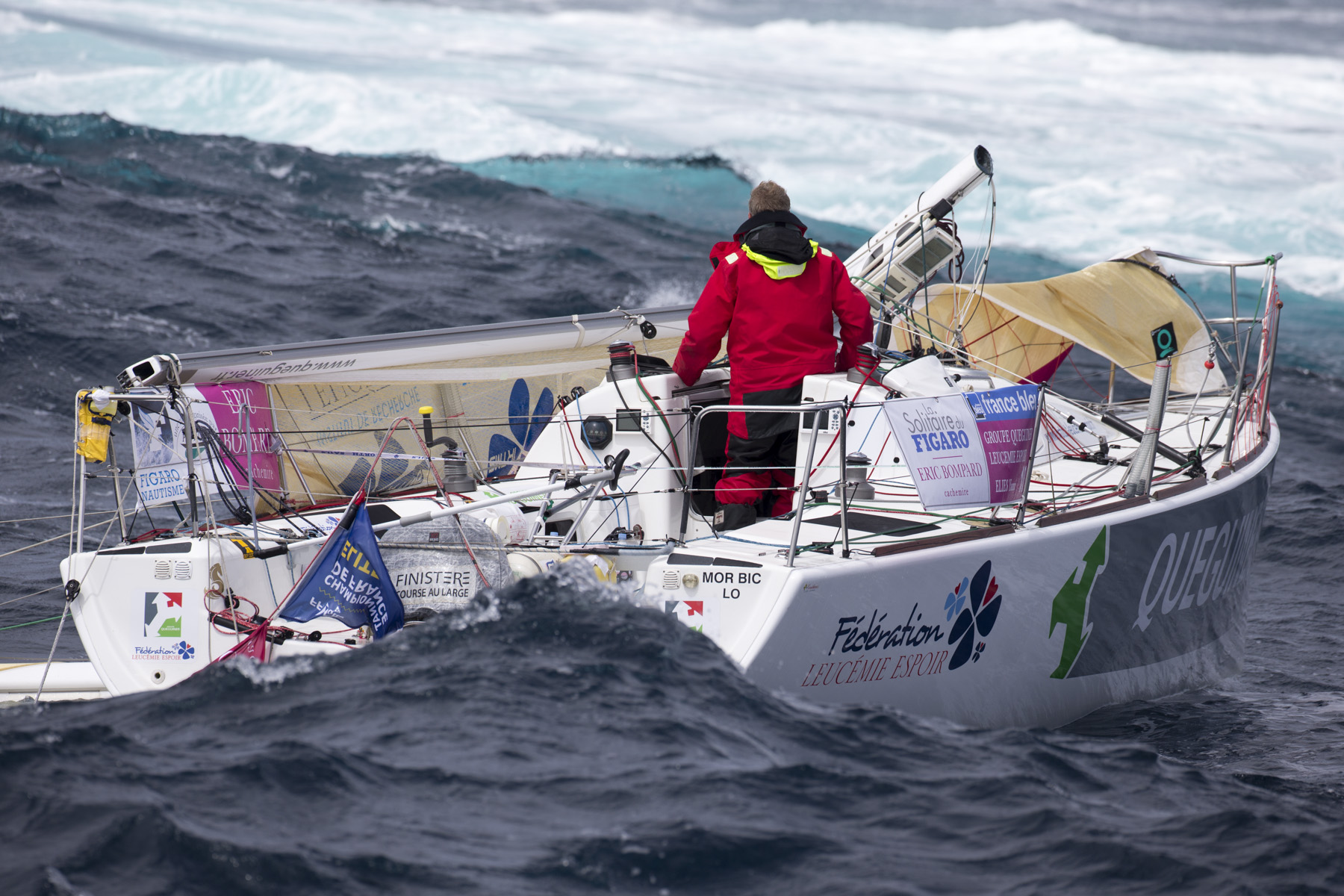 A 13h18, après son virement de bord à Wolfrock, Yann Eliès (Groupe Queguiner – Leucémie Espoir) vient de démâter. Le skipper est sain et sauf. Yann est entrain de libérer son gréement.