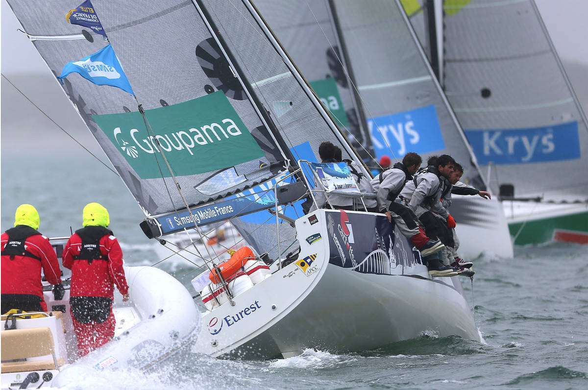 Les coureurs n’ont pas eu droit à l’erreur aujourd’hui ! Le vent qui est monté jusqu’à 25-30 nœuds a obligé les neufs équipages à rester concentrés jusqu’au bout pour ne pas dégringoler en bas du classement au moindre faux pas. Manœuvres enchaînées dans une coordination parfaite mais aussi départs au lof ou chalutages du spi : le spectacle était superbe aux passages des bouées. Courrier Dunkerque 3, vainqueur du prologue hier a presque fait un sans faute en remportant deux des trois parcours techniques. Les hommes de Daniel Souben, premiers au classement général provisoire ce soir, sont dans une très bonne dynamique. Ils devront cependant rester sur leurs gardes pour éviter de voir Groupama 34 gagner du terrain. Second au classement général, l’équipage mené par Fabien Henry en l’absence de Franck Cammas, signe une excellente 3ème manche et s’offre sa première victoire. Matthieu Di Russo, régleur de génois à bord, confiait à l’arrivée que l’équipage avait eu du mal à trouver les bons réglages sur les voiles toutes neuves que la flotte vient de recevoir. Les voiles sont en effet monotypes cette année, c’est-à-dire identiques pour tous. Cette monotypie semble ouvrir le jeu : les dés ne sont pas jetés au passage de la première marque et tout peut arriver jusqu’à la fin de la manche. Les amateurs de Normandy – Acerel (6èmes au général et premiers amateurs) ont ainsi pu prouver qu’ils en ont sous le pied. Ils se sont offerts deux très belles 5èmes places aujourd’hui. La journée a été plus difficile pour Be. Brussels – Bienne Voile qui, suite à une collision avec Ville de Genève – Carrefour Addictions, a dû abandonner après le 2nd parcours technique : leur tête de mât a été endommagée. Les jeunes suisses ont quant à eux fait une très belle entrée dans le classement général à la 4ème place.