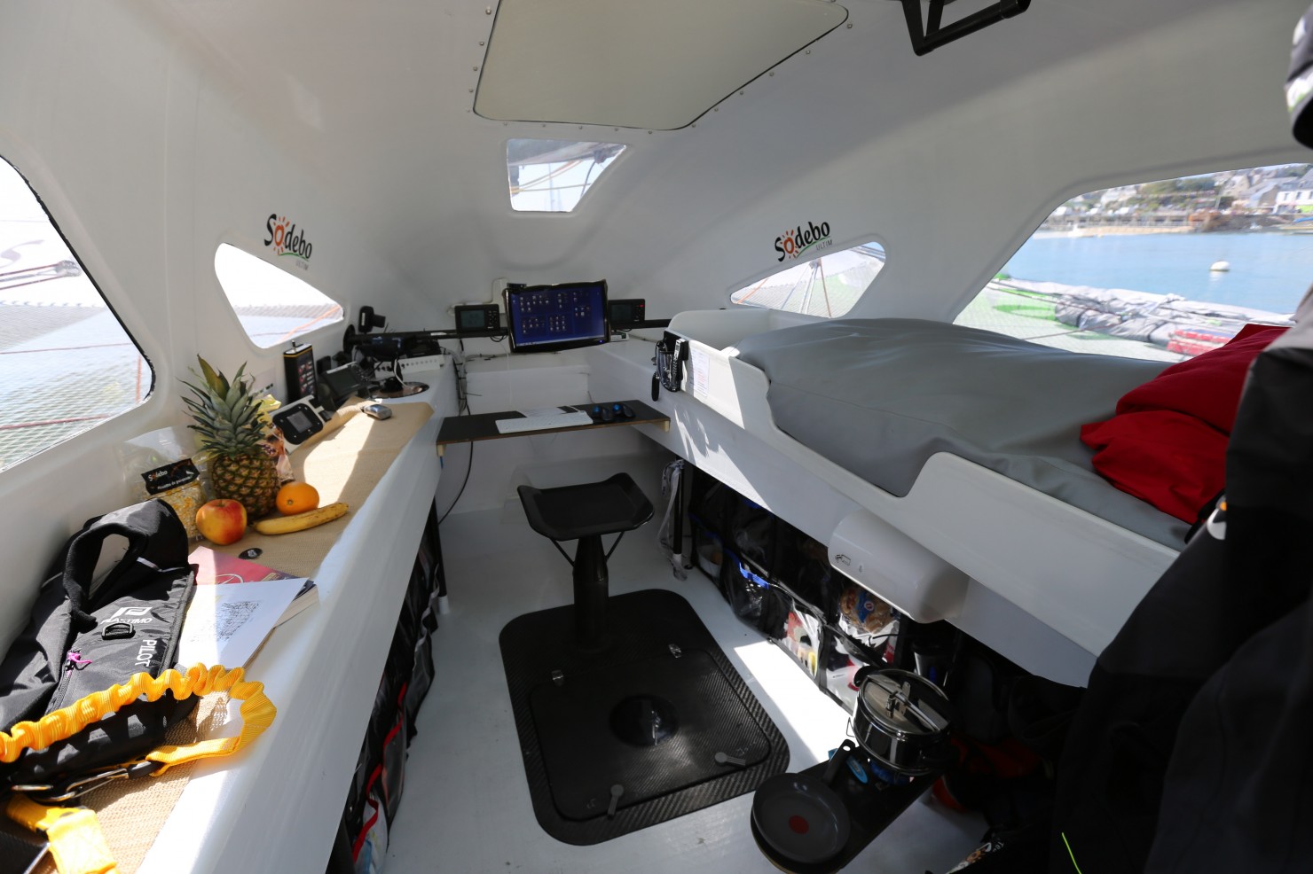 Trouver le sommeil dans cet univers hostile, un défi pour quiconque et une nécessité pour les coureurs au large qui doivent dormir pour rester lucides. Il fallait trouver une solution pour que le Marchand de Sable passe même quand les conditions météo agitent le bateau comme un shaker et qu’il faut avoir les commandes à portée de mains alors que les adversaires rôdent tout autour. Thomas a remplacé le matelas plus ou moins confortable qu’il avait installé dans les bannettes de ses anciens bateaux par un grand pouf étanche et robuste, rempli de billes. Ce pouf s’adapte parfaitement au corps et au sol sur lequel il est posé. Quand le solitaire s’accorde 10 à 20 minutes de répit à l’intérieur ou dans le cockpit, il ne prend pas le temps de se changer ni de se sécher. Par contre, il embarque tout de même un duvet pour lutter contre le froid.