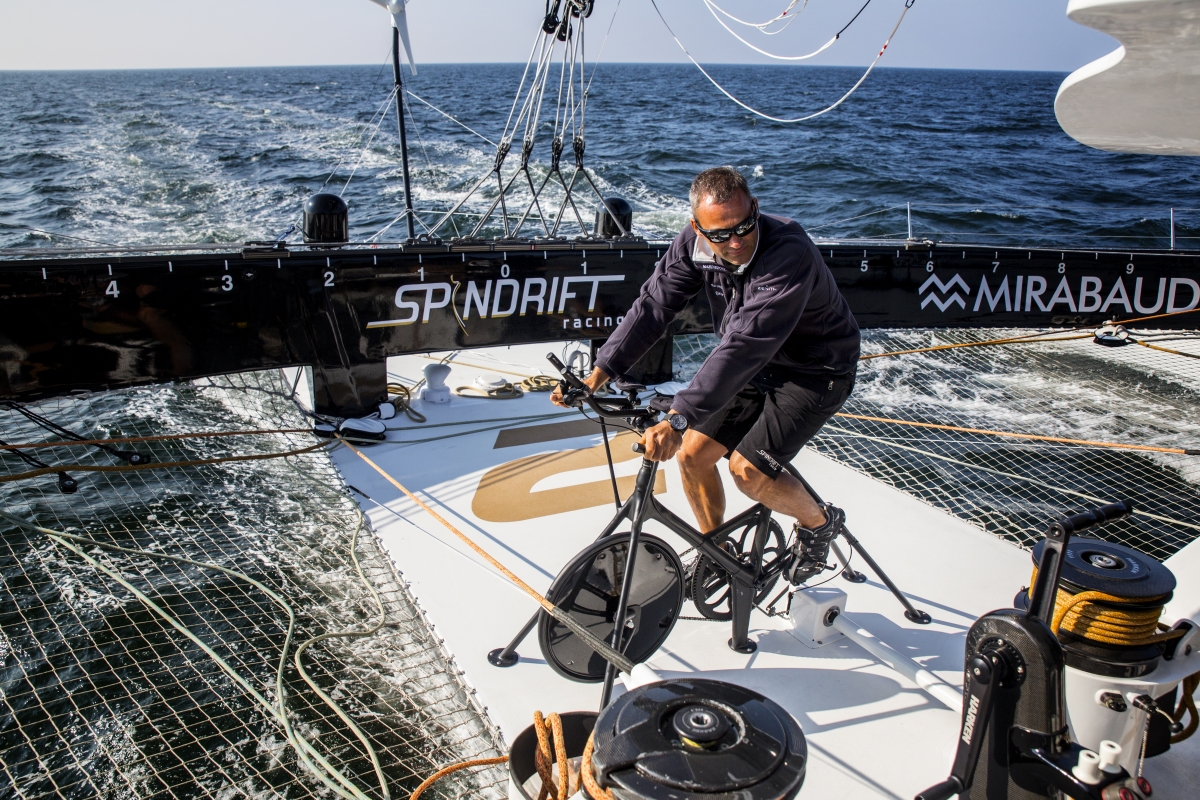 Il n’a jamais été question de faire de Spindrift 2 un bateau de solitaire. Le trimaran reste avant tout une arme redoutable en équipage mais le bureau d’études de Spindrift racing avec les techniciens choisis par Yann et Dona ont redoublé d’ingéniosité pour l’adapter néanmoins au challenge du ‘Rhum 2014’. De janvier à mars dernier, à l’abri des regards à Lorient, le géant a reçu beaucoup d’attention : le mât a tout d’abord été raccourci de six mètres, la voilure a donc été réduite de 20% afin d’être plus manœuvrable sans équipiers. Le cockpit a aussi été concentré pour pouvoir être utilisé par un seul homme. Un vélo a également été fixé sur le pont afin de permettre à Yann d’actionner les winches aussi bien avec les bras qu’avec les jambes. Enfin, système totalement essentiel au soliste en mer, un pilote automatique ‘Spindrift racing made’ a été inventé et mis au point. Comme il n’aura pas le don d’ubiquité pour autant, le skipper devra rester à portée des commandes de son trimaran et vivra donc à l’extérieur, sous la casquette, où une cellule de pilotage a été conçue, regroupant notamment son ordinateur et sa bannette.