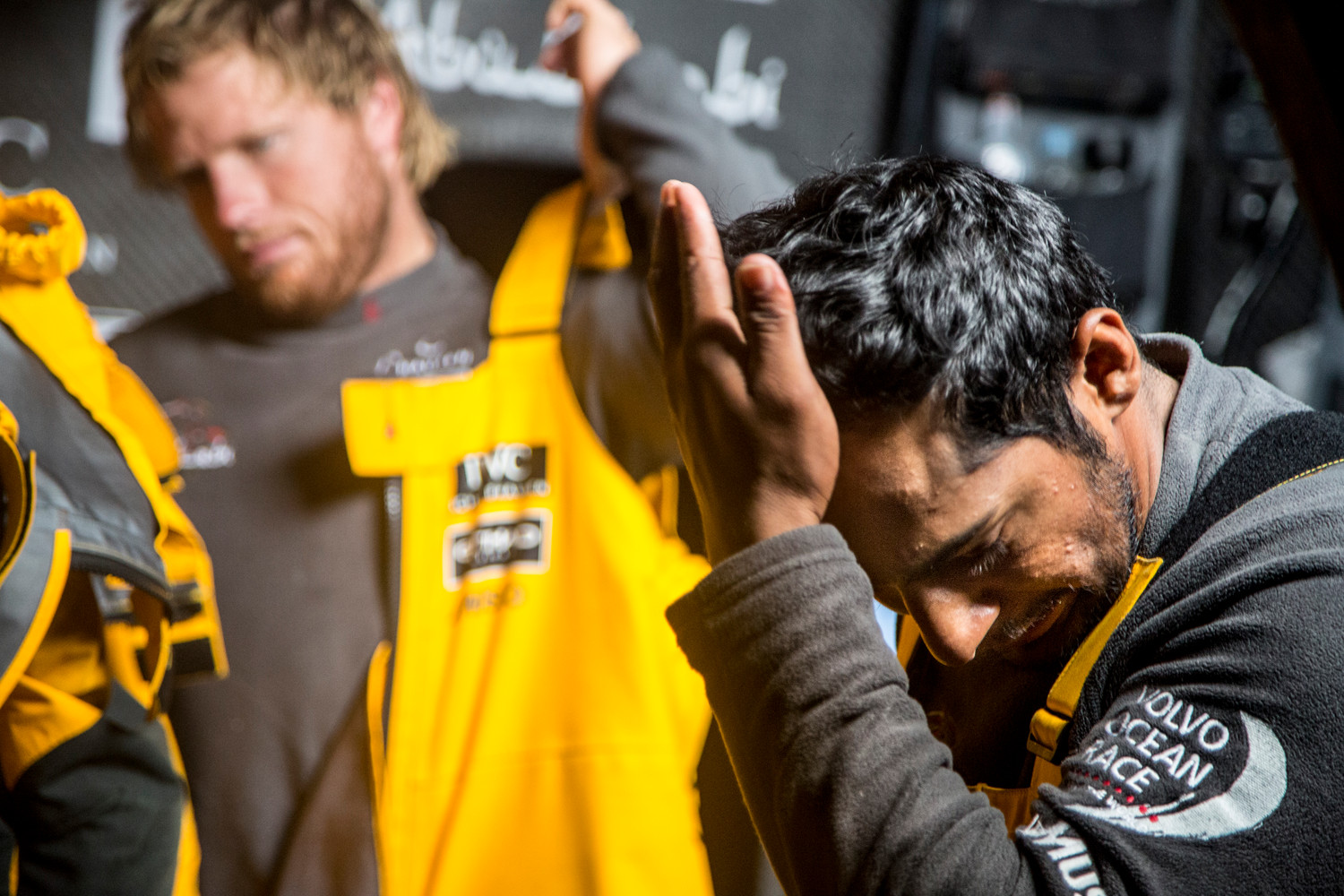 Sur le pont, les gars ont fait face aux vagues de quatre mètres de haut qui submergent le cockpit alors que nous surfons sur la houle océanique. A chaque fois, que nous sommes au creux de la vague, Azzam se prépare à affronter la vague suivante, une vague puissante qui peut te mettre à terre.