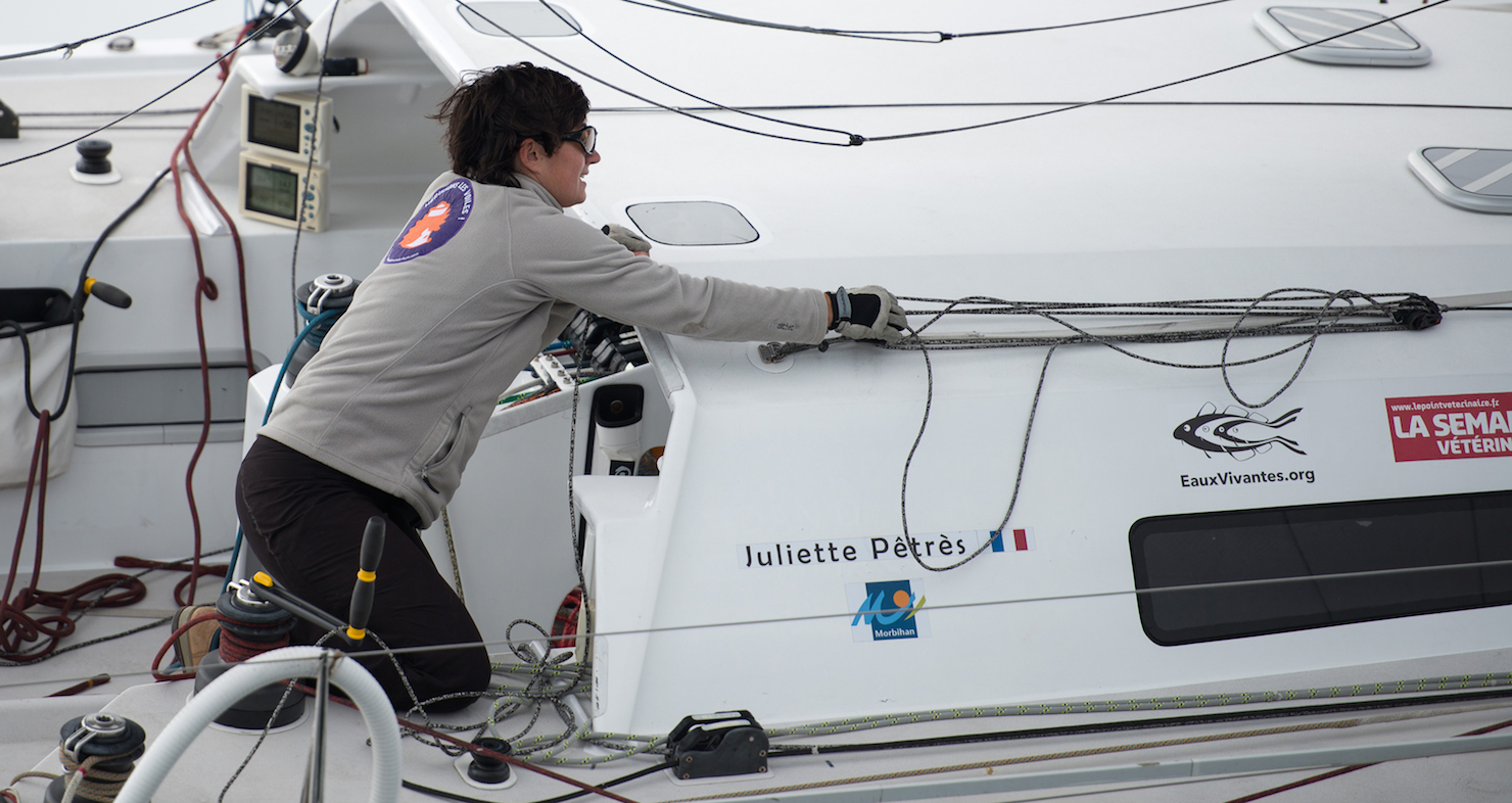 Juliette Petres, Class40, Eau et Patrimoine : [quote]Les conditions restent très ventées en début de Golfe. La première nuit a vraiment été très, très dure. J’ai fini épuisée sous 3 ris trinquette. Le front a été très actif et on a subi derrière des averses de grêle avec du gros vent. Ma trinquette (voile d’avant triangulaire) est déchirée mais je pense pouvoir la réparer très vite. Le bateau tient bien, j’ai pu faire un petit somme mais je reste prudente. Je suis maintenant avec 2 ris direction le sud. Vivement la rotation au nord-ouest. J’ai appris pour les abandons et j’en suis très triste. Courage à toutes les équipes.[/quote]