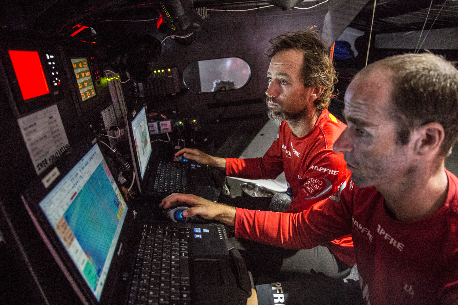 Nicolas Lunven était le second français à bord de MAPFRE. Navigateur du bord, la septième et dernière place de cette première étape n’a clairement pas plu à Iker Martinez, plus habitué à truster les podiums des épreuves internationales. Nicolas OUT. Michel ne pouvait laisser passer cela et conforte sa position quant aux bienfondés des options tactiques prises par Nicolas, mais non suivies par Iker.