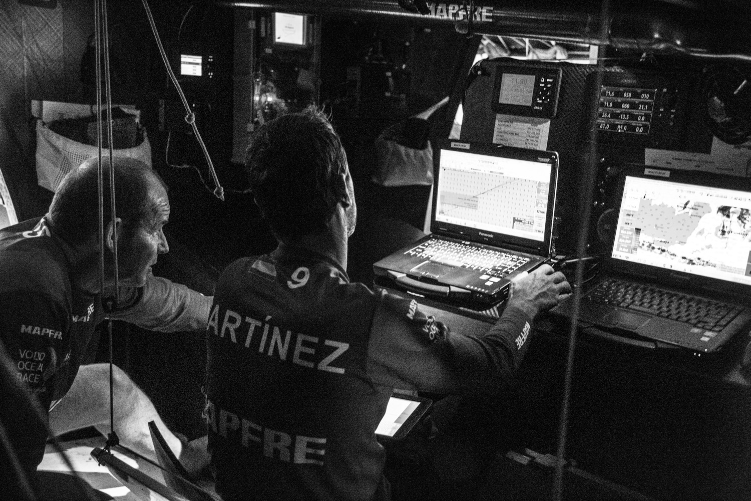 MAPFRE, Abu Dhabi Ocean Racing et Team Brunel ont navigué à vue les uns des autres. Pendant toute la nuit, ils ont navigué à moins de 4 milles d’écart.