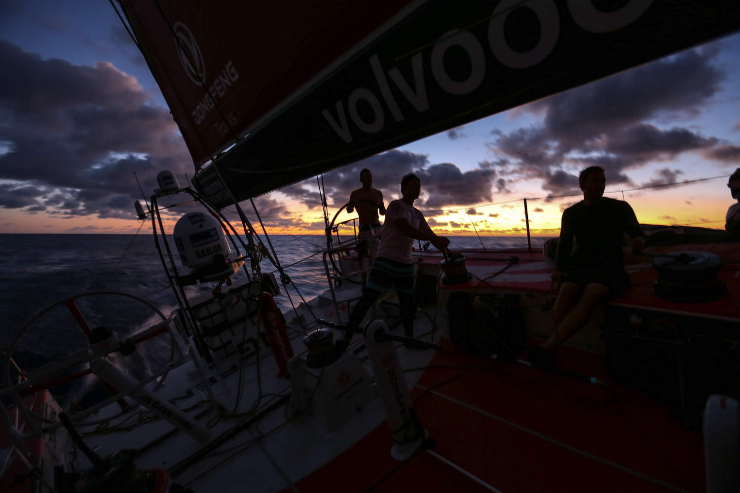 Pour la deuxième fois de cette Volvo Ocean Race 2014-15, la grande majorité de la flotte vient de passer, à nouveau, dans l’hémisphère nord. C’est Abu Dhabi Ocean Racing qui a le premier franchi l’équateur, suivi de près par les inséparables Team Brunel et Dongfeng Racing Team. Inséparables car depuis le 22 novembre, l’écart entre ces deux bateaux n’a jamais atteint les 10 milles et ils naviguent le plus souvent à vue. « C’est sûr que le rythme serait différent sans un bateau à côté. C’est un peu usant, mais très instructif » explique Eric Peron, à bord du bateau franco-chinois. Car naviguer aussi près est le meilleur moyen de tirer le meilleur profit des machines. « Quand on perd 1 milles ½ comme cette nuit, ça contrarie » résume Yann Riou, le reporter embarqué à bord du bateau chinois. Pourtant, Yann comme ses huit camarades savent qu’ils ont encore 2 000 à parcourir avant l’arrivée, soit un bon tiers de la course. Du côté d’Abu Dhabi, on ne relâche pas non plus les efforts même si l’on sait savourer cette place de leader acquise de haute lutte. « Nous sommes toujours en tête donc nous avons du faire quelque chose de bien » s’amuse Ian Walker qui offrirait un beau cadeau à son sponsor en arrivant en tête à Abu Dhabi. Selon les dernières estimations, l’arrivée pourrait se jouer d’ici 8 jours, c’est-à-dire le 13 décembre.