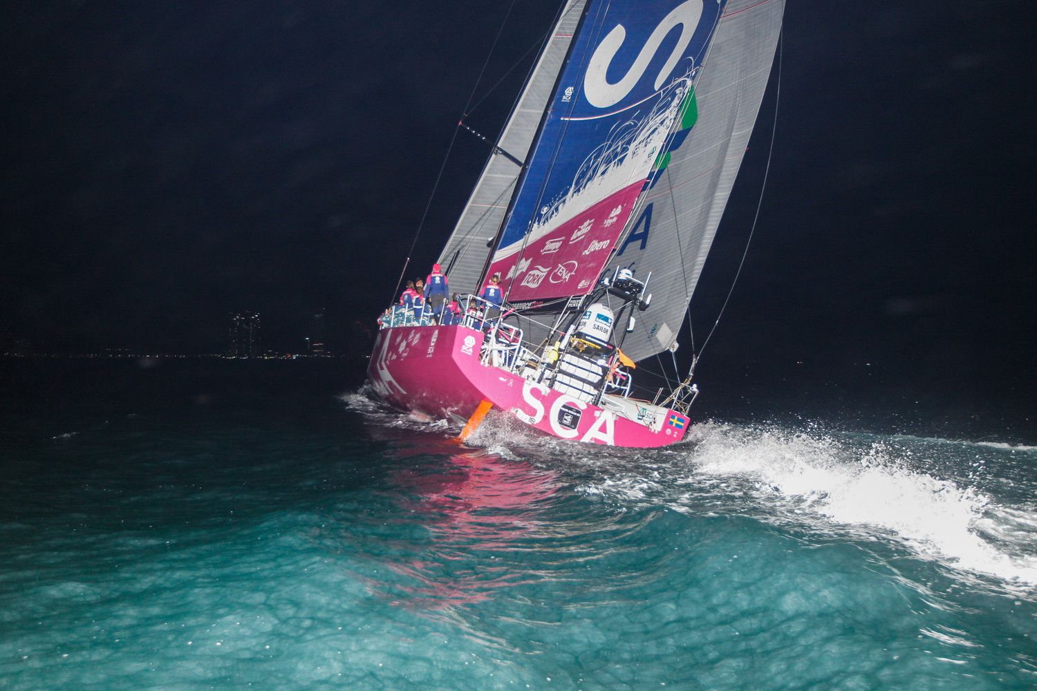 C’est dans la nuit noire que les filles de Team SCA ont franchi la ligne d’arrivée. Il était 2h23 du matin aux Emirats soit 23h23 (HF). L’équipage de Sam Davies a parcouru les 6 500 milles (distance réellement parcourue) de cette étape entre Le Cap et Abu Dhabi en 25 jours 6 heures 23 minutes et 34 secondes. Team SCA prend la 6ème place de cette deuxième étape.