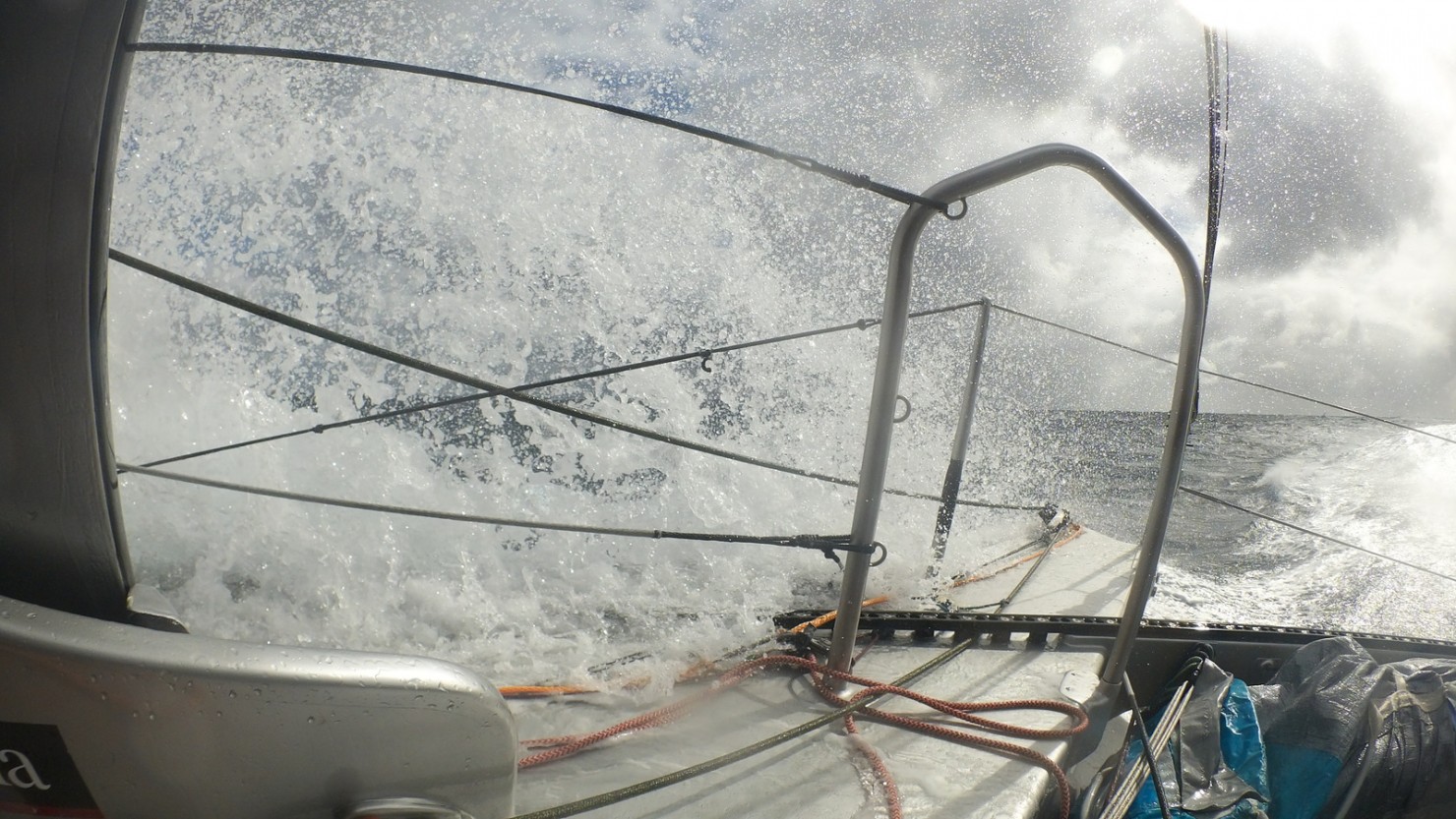 [quote]La mer devient plus agr éable. Le ciel est nuageux avec des coins de ciel bleu. Nous sommes heureux de trouver de meilleures conditions. Nous avons eu 45 nœuds de vent, une mer croisée avec des creux importants. Nous avions déjà affronté de très mauvaises conditions dans le passé. Mais c’est la première fois que le timing était tellement mauvais que nous avons dû couper notre vitesse. Maintenant la dépression est passée, nous naviguons au sud et il n’y a plus de danger.[/quote]