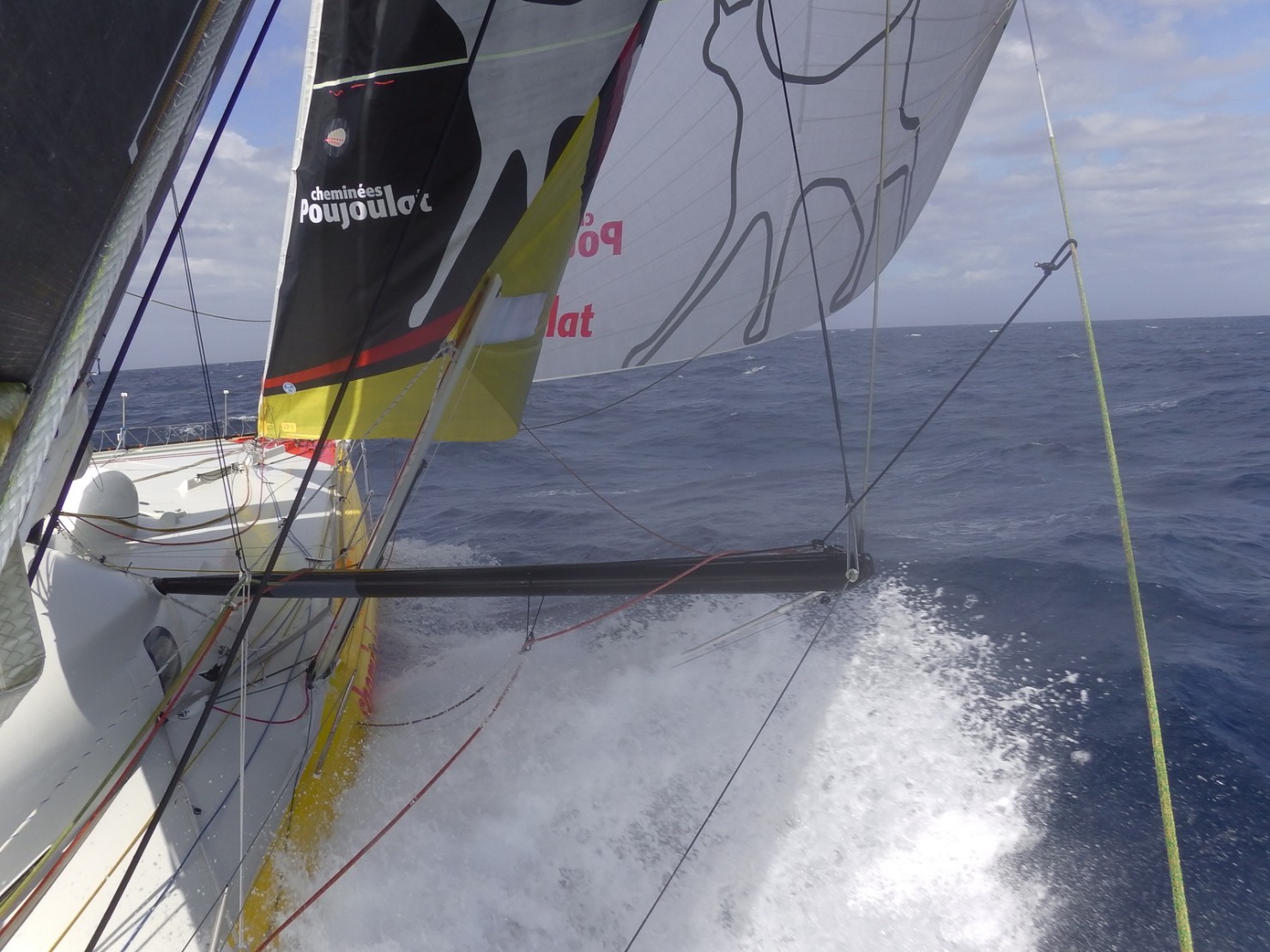 Hier on s’est dit qu’on sortait des mers du Sud. On a retrouvé un temps plus facile à manier. Ça fait du bien de changer un peu. On a repoussé la casquette de protection pour la première fois, hier. On a eu un peu de mal à la faire glisser, mais ça fait du bien de manœuvrer debout et pas accroupi là-dessous, de régler les voiles d’avant en les voyant. Mais là, on a déjà réappris à marcher, on tient debout dans le bateau et les températures remontent, c’est agréable.