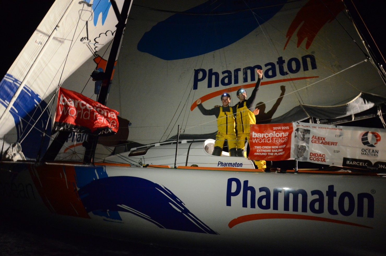 Aleix Gelabert et Didac Costa bouclent leur premier tour du monde en 98 jours, 09 heures, 12 minutes and 09 secondes sur les 23.321,76 milles de la route fond. One Planet One Ocean & Pharmaton a franchi en quatrième position la ligne d’arrivée de la Barcelona World Race à 21h 12mn 09s ce 8 avril 2015. L’équipage catalan a bouclé son tour du monde sans aucune escale (pénalisée dans cette épreuve à la vitesse moyenne de 9,88 nœuds. La distance effectivement parcourue durant cette course est de 27 791 milles à la vitesse surface de 11,77 nœuds.