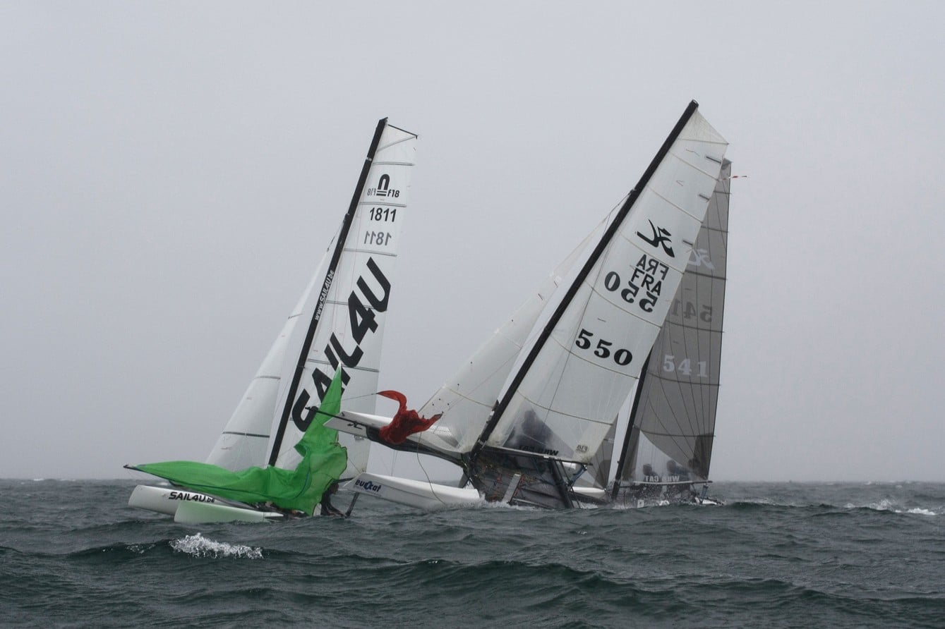 Les prévisions météo de ce matin n’étaient pas très favorables pour cette 2ème journée d’épreuve. En effet un vent de sud de 19 nœuds forcissant à 25 avec rafales jusqu’à 34 nœuds était prévu. Devant ces mauvaises prévisions, la direction de course a décidé de ne pas faire courir la longue distance et de lancer des courses à la place. Vers midi les présidents des comités de course C3/C4 et Flying Boats/Flying Phantom ont pris la décision de ne pas envoyer leurs compétiteurs sur l’eau, seule la série F18 s’est lancée dans une procédure de départ. Ils étaient 7 bateaux sur la ligne de départ de la première course du jour puis 15 sur la deuxième. L’équipage Perron/Robert a fait la bonne opération en remportant les 2 courses du jour, il se classe en tête du classement général provisoire. Il est suivi du duo Boulogne/Fanouillère puis de Duthil/Mourniac.