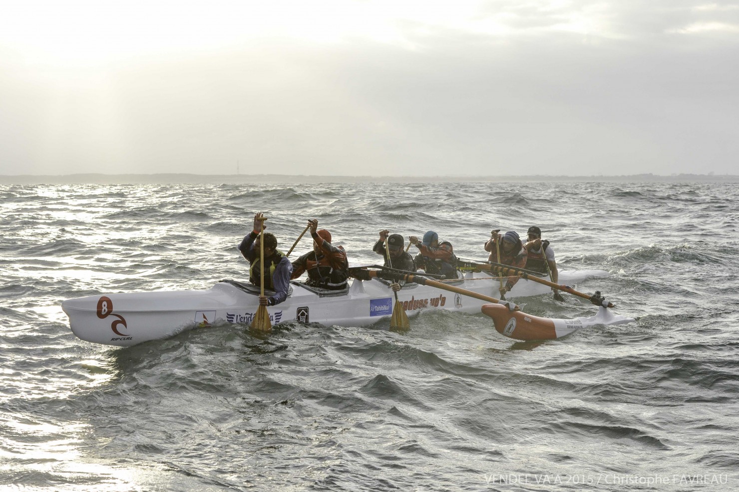 La foule est venue nombreuse dès 10h ce matin pour assister au beau spectacle du départ de l’étape aux Sables d’Olonne. Les pirogues en provenance du port ont accosté les unes après les autres sur la grande plage des Sables pour la mise en place du rituel de départ. A 10h, les rameurs se sont tous réunis pour la prière traditionnelle prononcée par Franki Tefaatau, coureur de l’équipe de Fontenay le Comte. A suivi le Haka pour booster les équipages. Le départ de la course a été donné à 10h15 par le Maire des Sables d’Olonne muni d’un drapeau aux couleurs de la ville. A la façon des 24h du Mans, les barreurs de chaque équipage ont couru jusqu’à leur pirogue avant de s’élancer en mer !