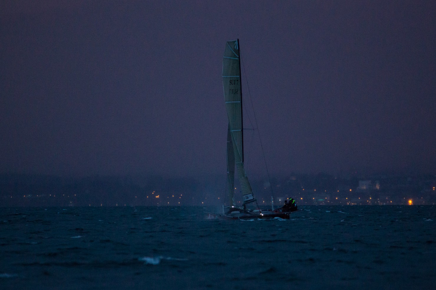 Des orages se sont enchaînés, accompagnées de vents violents. « Le vent a soufflé jusqu’à plus de 40 noeuds dans un grain, nous avons dû affaler toutes les voiles pour ne prendre aucun risque », explique Nils Palmieri, skipper de TeamWork. « Je n’avais jamais navigué dans des conditions si violentes! Team Seven nous a bien rattrapé et nous avons terminé avec un très beau duel. »
