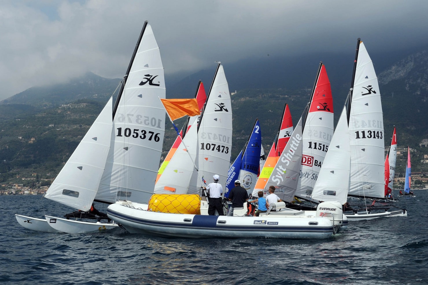 La pluie matinale a fait changer le vent de direction à Gargnano, Lac de Garde, pour le mondial Hobie Dragoon, le championnat d’Europe Hobie 16 Spi et les séries qualificatives Hobie 16 open.