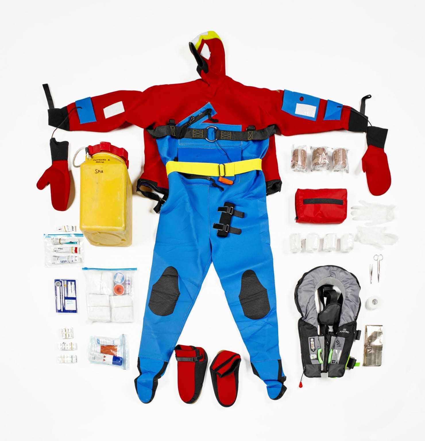 Il y en a deux à bord, à l’intérieur du bateau, prêts à être attrapés en cas de besoin. Le matériel qu’il contient est obligatoire et identique pour chaque bateau : une VHF portable, un téléphone iridium portable, une lampe torche, des fumigènes flottants, des aliments énergétiques, une couverture de survie, etc.