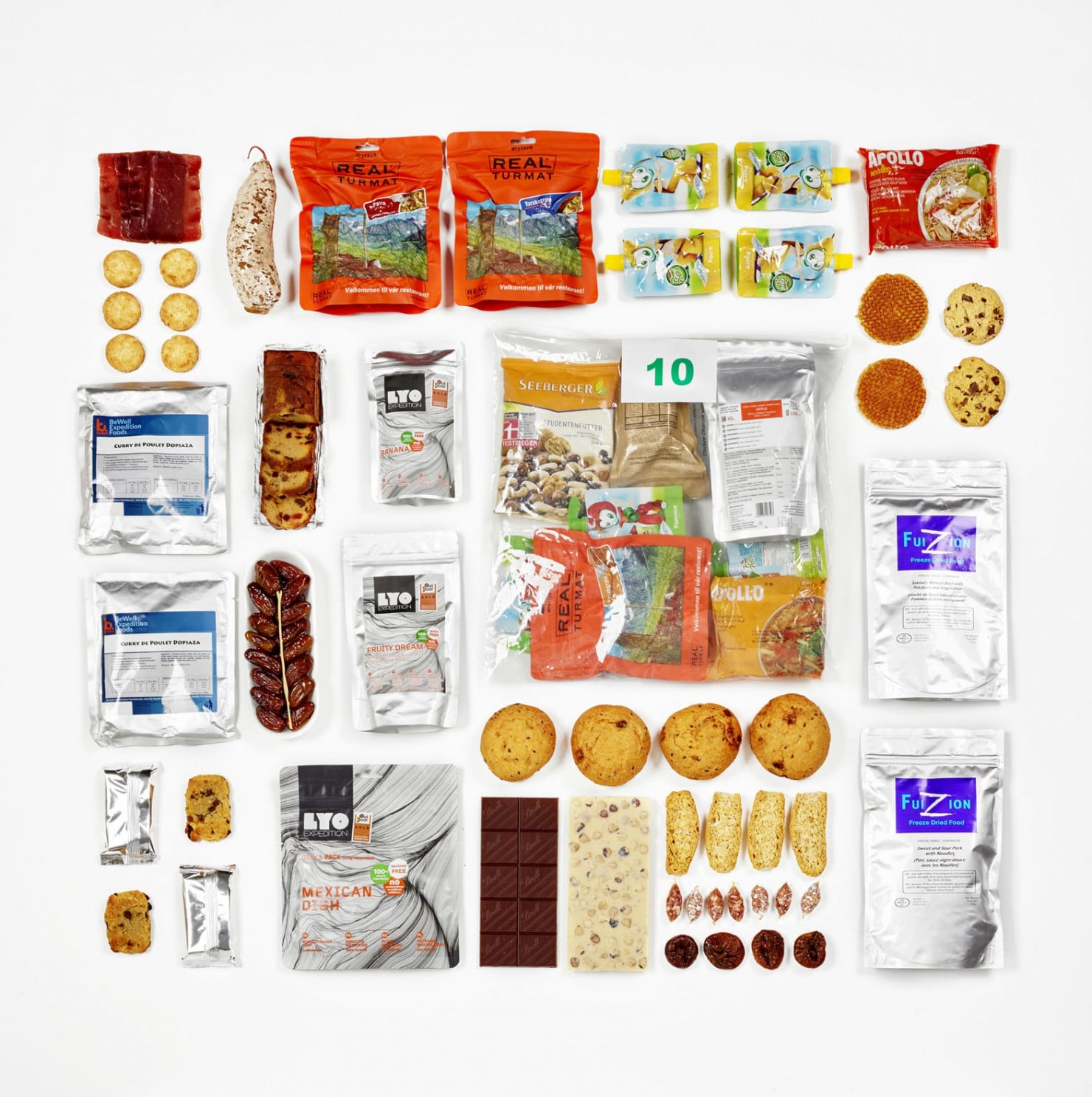En conséquence la nourriture embarquée est principalement composée de plats lyophilisés, légers et adaptés en termes de calories et de nutriments. Ces plats sont complétés par des aliments plus classiques comme des compotes en briquettes, nouilles chinoises, biscuits et barres énergétiques, viande de grisons…