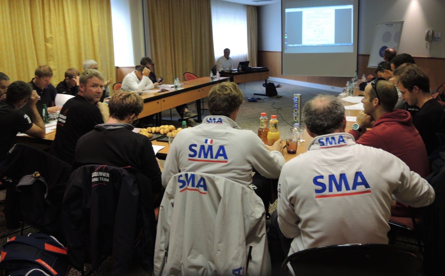 Créé en 1990 sous l’impulsion de grands champions tels que Michel Desjoyeaux, Jean Le Cam, Roland Jourdain, Jean-Luc Nélias, Marc Guillemot, Jacques Caraës ou encore Bertrand de Broc, convaincus de l’intérêt de se regrouper afin de mutualiser leur préparation sportive, et avec l’appui de Christian Le Pape, alors cadre à la Direction Départementale Jeunesse et Sport, et de Loïc Ponceau de Nautisme en Finistère, le Pôle Finistère Course au Large est aujourd’hui devenu la référence incontournable en matière de préparation des athlètes de haut niveau à la course au large. De fait, l’idée selon laquelle on peut optimiser la performance en solitaire en s’entraînant collectivement, est intelligente et efficace car basée sur l’échange et le donnant-donnant. Les plus grandes stars de la voile ont rapidement validé la méthode. Aujourd’hui, pas moins de 28 (21 en IMOCA, quatre en Class40 et trois en Ultim) des 84 skippers engagés dans la 12e édition de la Transat Jacques Vabre sont issus de la structure. Le Pôle Finistère a accompagné plus particulièrement 8 équipages IMOCA (Banque Populaire VIII, Edmond De Rothschild, Maître Coq, PRB, Queguiner-Leucemie Espoir, Safran, SMA, St Michel – Virbac) jusqu’aux derniers moments avant le départ de la course. Ce samedi en fin d’après-midi, ils avaient justement rendez-vous pour un ultime briefing et ce n’est autre que Jean-Yves Bernot qui leur a apporté son expertise et son regard sur la situation météo prévue sur le parcours. Alors, comment travaillent-ils avant une transat de ce type ? Eléments de réponse.
