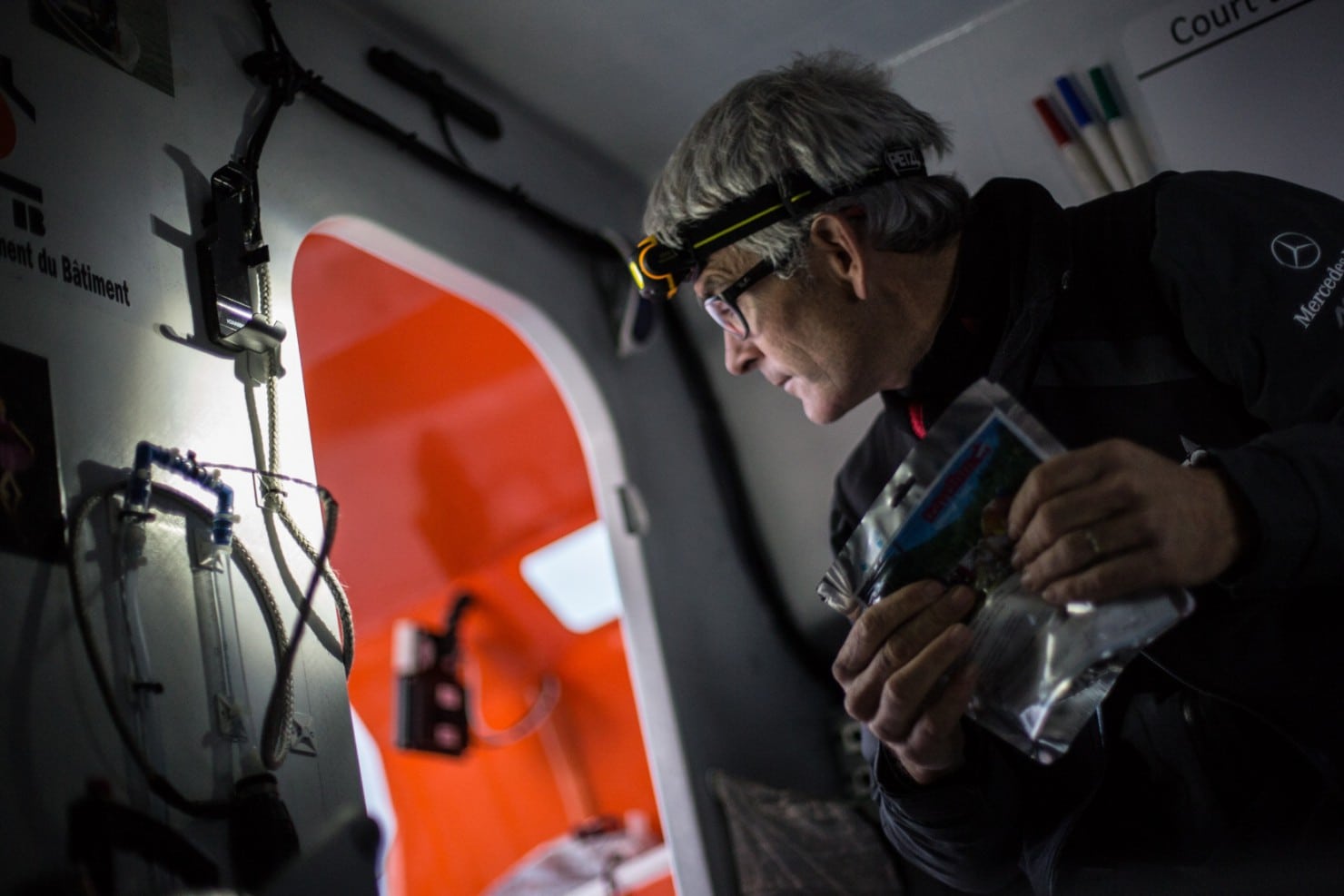 « Nous essayons de sortir de cette molle, de trouver la meilleure façon de faire, celle qui fonctionne le mieux, on verra dans quelques jours. Nous sommes dans cette dorsale depuis la nuit passée. On a été les premiers à la toucher, on la subit et on essaye de sortir et de prendre le chemin le plus court vers le Sud. C’est le Pot au Noir avant l’heure. Il faut rester vigilant. A bord, ça se passe très bien avec Bertrand, nous sommes contents d’être là. On a pas mal de boulot qui nous attend. La route est encore longue. Il va falloir que l’on monte en haut du mât, car nous avons des trucs à réparer là-haut. Nous restons très concentrés, l’ambiance est bonne… »