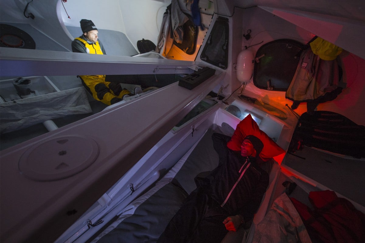 « Nous sommes au reaching entre 20 et 24 nœuds sous un ciel dégagé et une mer plate. On a choisi de se décaler pour ne pas coller à la baie de Rio et rester à l’extérieur mais nous verrons ça demain plus précisément avec les nouveaux fichiers météo. Ca glisse bien en ce moment, notre objectif est de continuer à garder le contrôle sur nos amis de Ciela Village et d’essayer de grappiller des milles à Erwan. Nous restons motivés et à l’attaque, la course n’est pas jouée tant que la ligne n’est pas franchie. Ce qui est pénible sur un 50 pieds, c’est qu’il n’y a pas d’endroit où tu peux vraiment te reposer, et c’est ça qui épuise à la longue. Nous sommes réguliers dans nos quarts donc hormis la fatigue physique accumulée depuis 15 jours, ça va plutôt pas mal… »