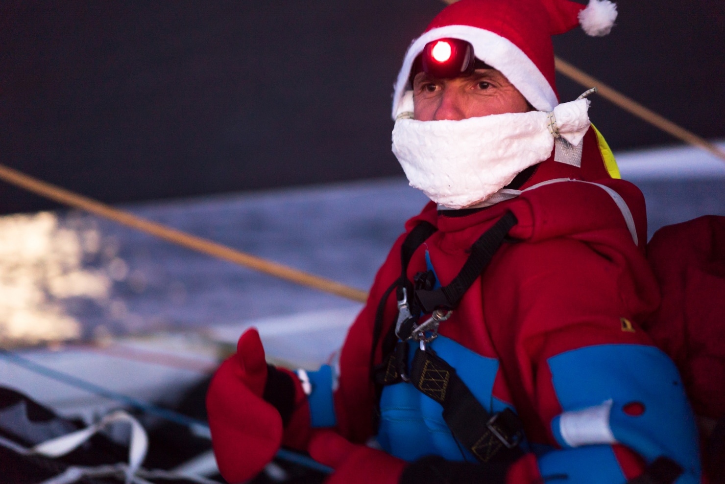 Oh, oh, oh, les enfants, le père Noël est passé aussi à bord de Spindrift 2 ! Vingt degrés dans l’air, dix-neuf dans l’eau, les marins ont profité d’un joyeux réveillon au large de l’Argentine et l’Uruguay ! Pour l’occasion, Xavier Revil a enfilé son plus beau costume, distribuant quelques cadeaux et gourmandises : saucisson, chocolat, petits mots des proches et dessins des enfants, chacun a été gâté et le moral de l’équipage est au plus haut. Et du moral, il en faudra car le maxi-trimaran a perdu en puissance depuis ce matin et traverse un anticyclone en approche du Brésil, à une vitesse moyenne autour des 12 nœuds. Après cette journée de calme, Spindrift 2 devrait accrocher une zone plus active à partir de demain samedi.