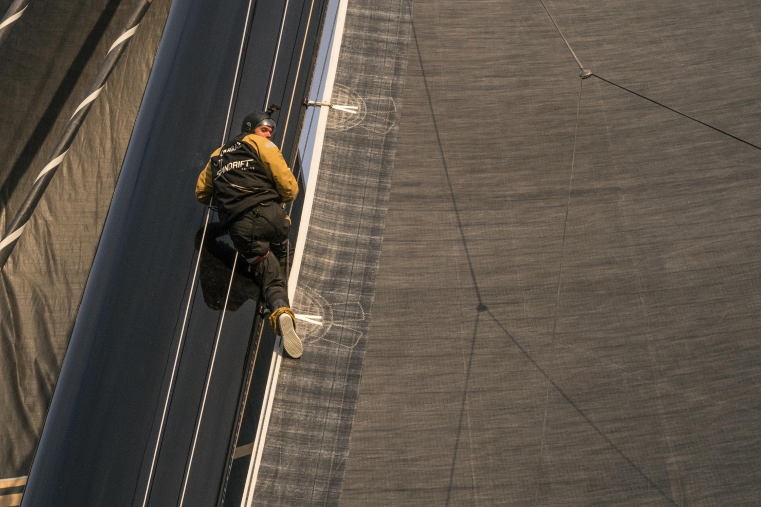 Puis Spindrift 2 est sorti de la dorsale en fin de soirée, un peu après le direct avec Itele où nous avons profité des conditions légères pour faire voler notre drone en live. Une première !