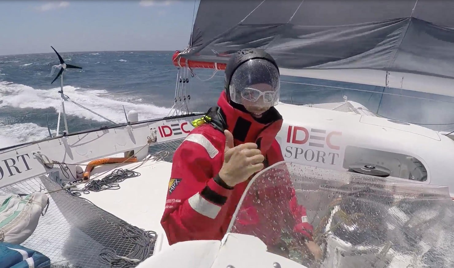 Les enjeux ? En finir avec ce tour du monde à la fois en sécurité et à la fois le plus rapidement possible. Avec quelques accessits pas neutres à glaner au passage ! Par exemple le chrono établi par Franck Cammas et ses 9 hommes d’équipage en 2010 sur le même bateau, alors sous les couleurs de Groupama. Voilà cinq ans, ils avaient mis 48 jours, 7 heures et 45 minutes et glané le Trophée Jules Verne qui sera battu deux ans plus tard par le Banque Populaire V de Loïck Peyron. « Oui, c’est une motivation supplémentaire », admet en souriant Francis Joyon, « le Trophée nous échappe bien sûr, mais c’est aussi dans cette idée qu’on a gardé le grand gennaker aussi longtemps cette nuit ». Comme IDEC SPORT en est à 45 jours et demi à 15h ce mercredi après midi, c’est même jouable de gagner près d’une journée sur ce chrono. Enfin, pour l’anecdote il y a un autre record personnel à battre dans l’équipage : celui de Bernard Stamm qui était de l’équipage victorieux de Bruno Peyron en 2005 à bord du maxi catamaran Orange II (50 jours 16 heures). Francis Joyon en rigole : « ah oui c’est vrai, ça, Bernard était sur Orange ! Bon, et bien on va essayer de battre les deux… » Il reste 48 heures chrono et 1200 milles de gros temps pour mener à bien la mission.