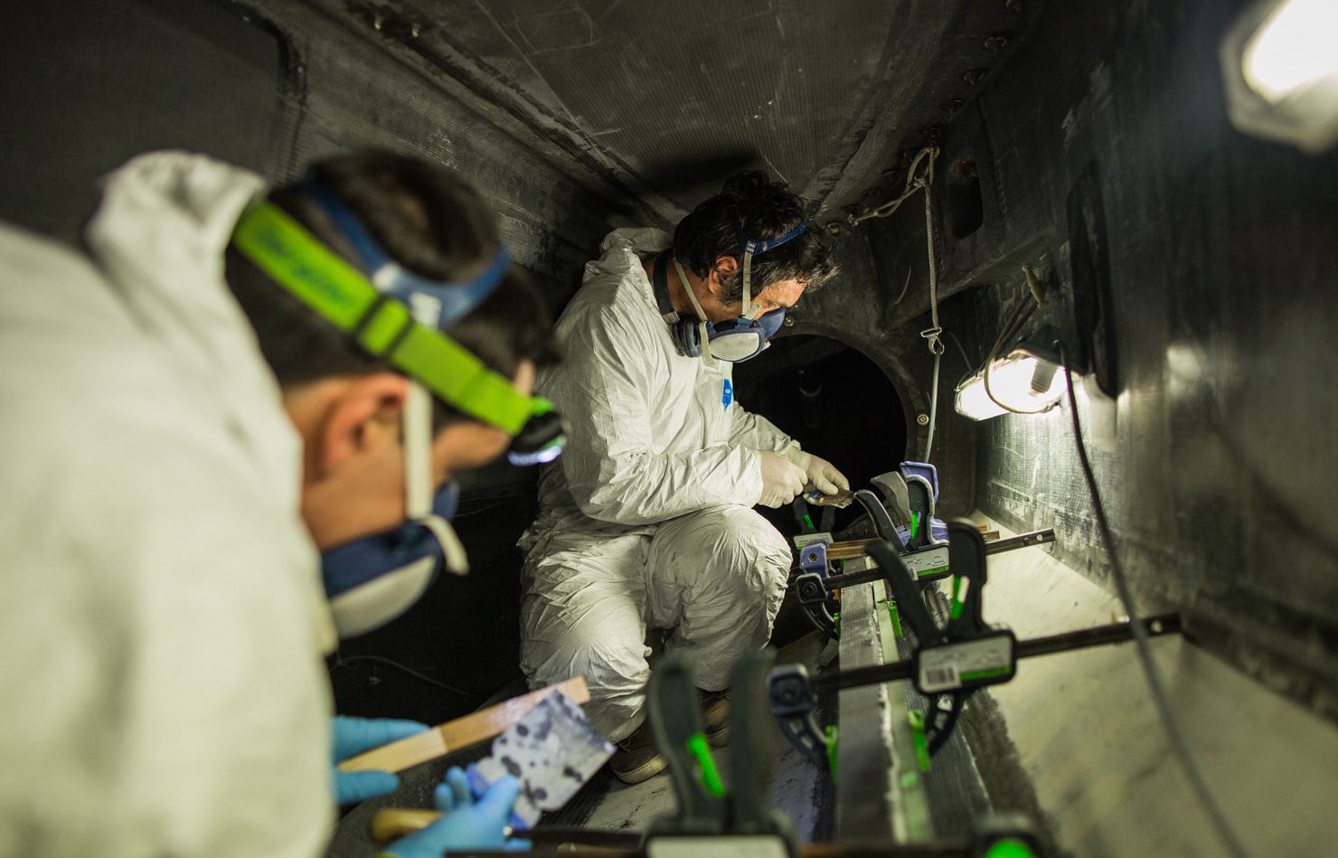 « Nous avons terminé 2015 avec un vrai problème situé sur le palier avant de la quille du Souffle du Nord pour Le Projet Imagine. Après quelques études approfondies de ce souci technique avec les architectes du bateau, nous nous sommes rendus compte que nous pouvions garder l’ensemble des pièces. Les manques de matière suite aux différents chocs vont être rechargés en soudure et certains éléments seront ré-usinés. »